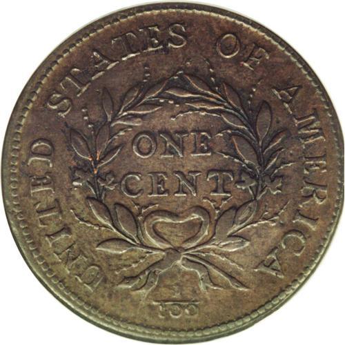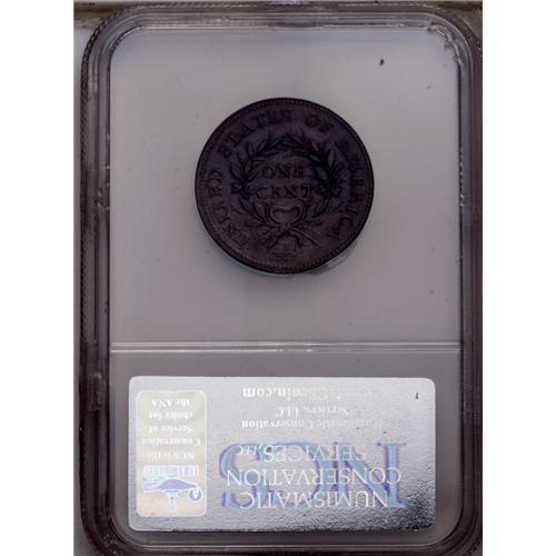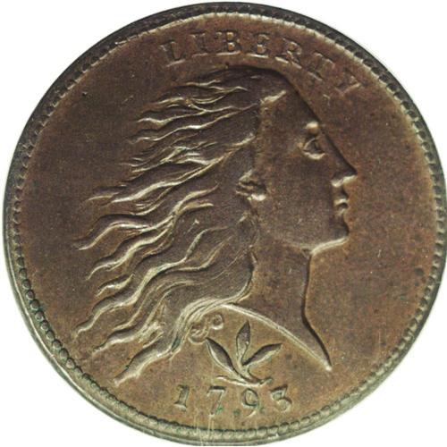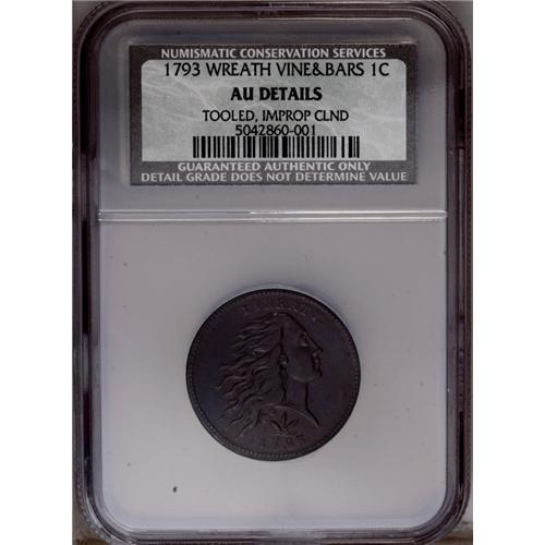 <B>1793<1C> Wreath Cent--Vine and Bars--Tooled, Improperly Cleaned--NCS. AU Details.</B></I> S-9, B-12, R.2. This bold lavender-brown example has the initial appearance of an exceptional example of this desirable first-year large cent type. Careful examination reveals that the piece has been burnished to smooth the surfaces, and the highpoints of Liberty's hair have been finely tooled to convey misleading sharpness. EAC 12.