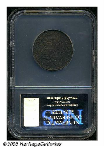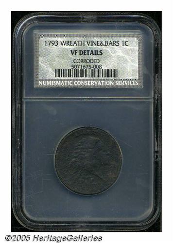 <B>1793<1C> Wreath Cent--Vine and Bars--VF Details, Corroded, NCS.</B></I> S-6, R.3. Dark brown in color with areas of faded reddish verdigris. A rough example, but the types and legends are clear. First year Large Cents are coveted by collectors, due to their scarcity and historical importance.