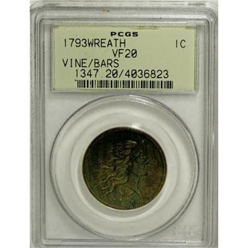 1793 1C Wreath Cent--Vine and Bars-- VF20 PCGS. S-8, B-13, R.3. Horizontal stem parallel to the date. The bow is high and triangular. The existing detail reveals a sharpness grade of XF40, with light, evenly distributed porosity on both sides. Dark steel and greenish-brown color is accompanied by lighter brown on certain highpoints of the design. The EAC and PCGS grades of this specimen are comparable. EAC 20.<BR><BR><B>Coin Engraver:</B> Henry Voigt<BR><BR><b>Shipping:</b> Coins & Currency (<a target="_blank" href="http://www.heritageauctions.com/common/shipping.php">view shipping information</a>)