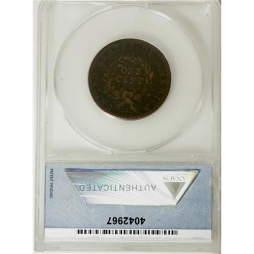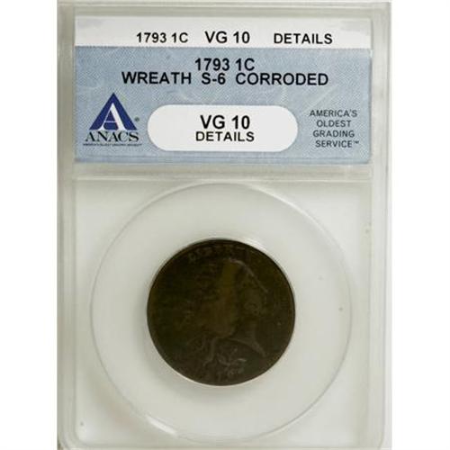 <B>1793 1C Wreath Cent--Vine and Bars--Corroded--ANACS. VG10 Details.</B></I> S-6, B-7, R.3. Easily identified by the position of the leftmost leaf tip. The obverse shows olive-brown highpoints with deeper color in the fields, while the reverse highpoints are reddish against charcoal fields. Fairly even microporosity is noted on both sides. The planchet is fairly well centered, and there are no visible rim bumps. Only the major devices are visible on the obverse, with a weak 3 in the date, but there is considerable pleasing detail remaining on the reverse. EAC 5.<BR><BR><B>Coin Engraver:</B> Henry Voigt<BR><BR><b>Shipping:</b> Coins & Currency (<a target="_blank" href="http://www.heritageauctions.com/common/shipping.php">view shipping information</a>)