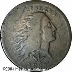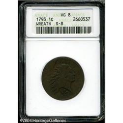 1793 1C Wreath Cent--Vine and Bars--VG8 ANACS. S-8 <B>1793 1C Wreath Cent--Vine and Bars--VG8 ANACS.</B></I> S-8, Low R.3. The triangle-shaped wreath and the long, curved fraction bar identifies the Sheldon marriage. A golden-brown example with pleasing obverse definition, CENT and STATES are faint but legible. The edges have a few minor bruises and the upper obverse border has a couple of thin, mint-made planchet streaks and small pits. <BR><BR><B>Important notice:</B> Heritage usually auctions material at the rate of 200-250 lots per hour. On some occasions eBay Live bid software or the Internet may not be able to keep up with the pace of the auction. We recommend placing a realistic absentee bid now as insurance to avoid disappointment. Occasionally the auctioneer may eliminate or reject an eBay Live bid, and the auctioneer may also reopen a lot after the close of the eBay live bidding (usually because we missed an audience bid), and may reject your bid even if it shows you as the winning bidder. By bidding via eBay Live, you agree that Heritage may award the lot to another bidder at its sole discretion under the circumstances described above or any other reasonable circumstances. Since eBay bids are not shown to us until we open the lot on the floor, we treat those bids just like floor bids. In most cases the floor responds before the eBay bid is presented to us, due to Internet lag time, so for consistency we have made it a policy that floor bids are always considered first over tie eBay live bids. Also please note that all Heritage lots purchased through eBay Live carry a 20% Buyer's Premium. Please make sure you read the Terms and Conditions before you bid. This lot is being auctioned in conjunction with a live floor auction by Heritage Galleries & Auctioneers. All final auction and invoice information will be supplied by Heritage Galleries & Auctioneers, and all other information should be considered preliminary. Lot:5026