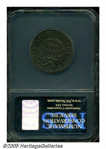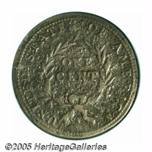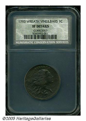 <B>1793<1C> Wreath Cent--Vine and Bars--XF Details, Corroded, NCS.</B></I> S-6, R.3. Liberty's profile is bold, and all legends are clear on this rough representative. The dark fields contrast with lighter lilac-brown devices. Although porous, this piece would be an impressive addition to a comprehensive type set. Sheldon-6 can be attributed by the location of LIBERTY; nearly the entire legend is left of the forehead, unlike the other Wreath Cent obverses.