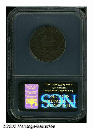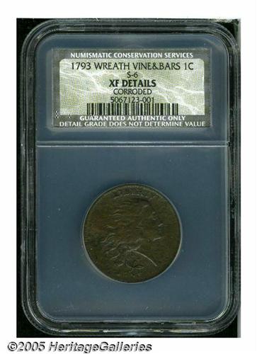 <B>1793<1C> Wreath Cent--Vine and Bars--XF Details, Corroded, NCS.</B></I> S-6, R.3. All legends are sharp, and the devices are bold. This medium brown example has a lightly granular reverse and a somewhat porous surface along the obverse border. Smoothing is evident near 8 o'clock on the obverse, and a few light pinscratches are noted in the upper right field near the profile.