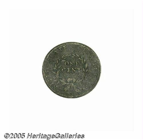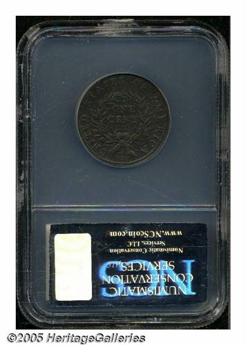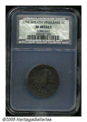 <B>1793<1C> Wreath Cent--Vine and Bars--XF Details, Corroded, NCS.</B></I> S-6, R.3. A medium walnut-brown example with pleasing sharpness. All legends are fully legible, including the date and fraction. The major devices also show ample definition. The surfaces are generally moderately porous, with somewhat more extensive roughness on the neck and on the lower right obverse field. A pair of old and unimportant pinscratches are concealed within Liberty's back hair tresses.