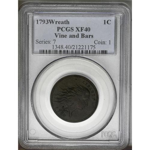 1793 1C Wreath Cent--Vine and Bars-- XF40 PCGS. S-9, B