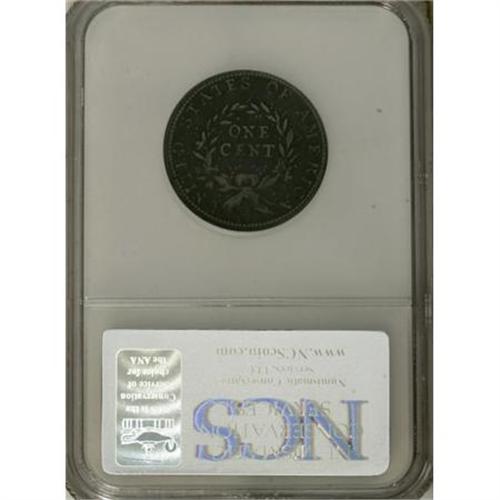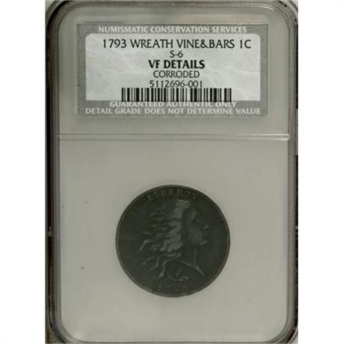 <B>1793 1C Wreath Cent--Vine and Bars, Corroded--NCS. VF Details.</B></I> S-6, B-7, R.3. An impressively detailed example of this early and briefly produced type. The fields are dark, and consistently (if moderately) granular. The highpoints appear ocean-blue. Faded marks are noted near LIBERTY and the M in AMERICA. EAC 10.<BR><BR><B>Coin Engraver:</B> Henry Voigt<BR><BR><b>Shipping:</b> Coins & Currency (<a target="_blank" href="http://www.heritageauctions.com/common/shipping.php">view shipping information</a>)