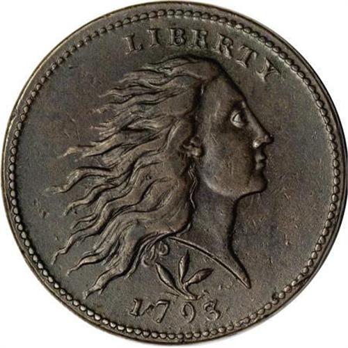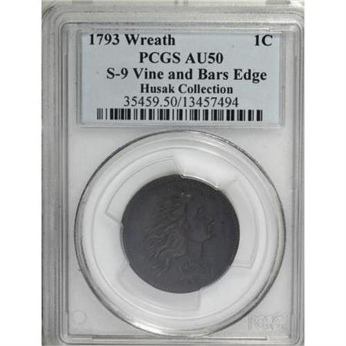 <B>1793 1C Wreath, Vine and Bars Edge. AU50 PCGS. S-9, B-12, R.2. </B></I> <B>Noyes VF20; tied for CC-21. Photo #36165. Our EAC Grade VF25.<BR><BR>Equivalents.</B></I> Crosby-Levick 7F; Frossard 7.2; Proskey 10; Doughty 11; Crosby 9-H; McGirk 2-G; EAC 12; <I>Encyclopedia</B></I> 1641; PCGS #1347.<BR><B><BR>Variety.</B></I> Horizontal stem parallel to the date. The bow is large and rounded. The obverse appears on S-8, S-9, and NC-4. The reverse appears on S-9. Vine and Bars Edge. The S-9 is the single most common Wreath cent variety by a wide margin.<BR><B><BR>Surfaces. </B></I>An attractive piece with smooth, hard, glossy surfaces. Both sides have mottled golden-brown and deep steel color, probably cleaned and recolored. A few minor handling marks are visible on the obverse, with a small reverse edge bump over M. Light corrosion is evident, primarily on the reverse. Full obverse and reverse borders are visible, with the reverse imperfectly centered. Both sides are sharply detailed, and the obverse and reverse types stand boldly against the field.<BR><B><BR>Die State VII.</B></I> The reverse has die cracks through R and CA of AMERICA, and from the left stem through UNIT. A late die state, although most of the individual die defects Breen describes are faintly visible.<BR><B><BR>Census.</B></I> Perhaps 10 examples are known in Mint State. This piece has considerable sharpness but is downgraded for various minor imperfections.<BR><B><BR>Commentary.</B></I> The S-9 is clearly the most common Wreath cent variety, and the only 1793 large cent of any design with a rarity rating less than R.3. Sheldon mentioned in <I>Early American Cents</B></I> that S.H. Chapman considered this variety to represent 35% of all existing Wreath cents. From a mintage of 63,353 Wreath cents, this would imply a "mintage" of about 22,000 coins.<BR><BR>One famous example of this variety is the "Space Cent" that was carried aboard Gemini VII in December 1965, manned by Col. Frank Borman and Capt. James A. Lovell. The craft orbited Earth 206 times before its return.<BR><BR>In the March 1988 issue of <I>Penny-Wise</B></I>, copper enthusiast Robert W. Miller, Sr. compared the S-9 to the famous Smith counterfeit 1793 cents:<BR><BR>"Sometime after large cents were recalled, early collectors noticed cents of 1793 were hard to come by. A New York City jeweler named Smith filed down cents of 1794 and reengraved, by hand, copies of 1793 cents. Smith must have used a real S9 cent as his model, as the copies are very close in design to a S9. All of the hair is very flat and the surfaces unusually smooth. Since quite a few were made, possibly 50 - 200, each example is different in lettering and wreath detail. If you have a S9 with flat hair detail, and nice surfaces, check carefully as you may own a Smith counterfeit and not know it."<BR><BR><B> </B></I>Raw material for copper coinage at the new Mint came from a variety of local sources, none particularly ideal, generally consisting of scrap, rough ingots, or sheet. In Breen's <I>Large Cent Encyclopedia,</B></I> contributor Craig Sholley wrote: "The locally obtained scrap proved to be especially troublesome. Copper is a difficult metal to properly melt and it is far more difficult to roll than silver or gold. The Mint, lacking both experience and proper equipment, was not prepared for either of these operations."<BR><BR>The first of the two processes required that Mint personnel melt the metal and pour it into ingot molds, while watching for retained gas bubbles or impurities. Bubbles in the metal resulted in split planchets, laminations, or other defects to the finished coins. Impurities resulted in various streaks or discoloration spots.<BR><BR>The other process was rolling the ingots into planchet strip of the appropriate width and thickness. The Mint used horsepower-operated rollers that were apparently poorly made. Coinage of the Wreath cents was suspended after the April 19 delivery while the rollers were repaired.<BR><BR><B>Provenance.</B></I> <I>Bowers and Merena (1/1990), lot 1074; Bud Lee (3/1997)</B></I>.<BR><BR><B>Personality.</B></I> <B>Henry Voigt</B></I> (sometimes spelled Voight) was the first chief coiner at the Philadelphia Mint. President Washington appointed him to the position on January 29, 1793, and he served in that capacity until his death on February 7, 1814. He was a clockmaker by trade, known for his skill and knowledge of mechanics. He also held a patent for boats propelled by cattle. Some confusion surrounds his early life. In <I>American Numismatic Biographies</B></I>, Pete Smith notes that Voigt was born in Germany in 1744. However, R.W. Julian writes in his article "Aspects of the Copper Coinage" (ANS, <I>Coinage of the Americas Conference</B></I>, 1996) that Voigt was born about 1745 in Pennsylvania.<BR><BR><b>Shipping:</b> Coins & Currency (<a target="_blank" href="http://www.heritageauctions.com/common/shipping.php">view shipping information</a>)