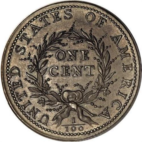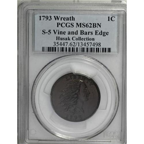 <B>1793 1C Wreath, Vine and Bars Edge. MS62 Brown PCGS. S-5, B-6, R.4. </B></I> <B>Bland AU50; tied for CC-6. Noyes AU50; tied for CC-7. Photo #59278. Our EAC Grade AU50.<BR><BR>Equivalents.</B></I> Crosby-Levick 4C; Frossard 4; Proskey 7; Doughty 7; Crosby 6-F; McGirk 2-C; EAC 6; <I>Encyclopedia</B></I> 1637; PCGS #1347.<BR><B><BR>Variety.</B></I> Large date and LIBERTY. The bow is small and heavy. The obverse appears on S-5. The reverse appears on S-5, S-6, S-7, and NC-5. The obverse has large letters in LIBERTY, similar to the earlier Chain cents. All remaining Wreath cent obverses have smaller letters. Vine and Bars Edge.<BR><B><BR>Surfaces. </B></I>Above-average surfaces have attractive olive and steel-brown color, with a tiny nick on the cheek that is the only obvious provenance marker on either side. Both sides are glossy with traces of luster in the protected areas, especially visible on the reverse. Sharply struck and nicely centered with a full border.<BR><B><BR>Die State I. </B></I>Early die state with no evidence of rim crumbling over LIBERTY. The border beads at the upper right merge, giving the general appearance of denticles. A faint reverse die crack joins the tops of TE in UNITED to a bead just left of the adjacent D, called die chips by Breen.<BR><B><BR>Appearances.</B></I> The obverse is illustrated in <I>Early American Cents</B></I> and <I>Penny Whimsy</B></I>. The obverse and reverse are illustrated in Noyes (2006).<BR><B><BR>Census.</B></I> Five Mint State pieces and three AU coins are recorded in Del Bland's Census, including a remarkable prooflike coin that Breen considered to be a specimen strike. One of the Mint State pieces is held by the ANS.<BR><BR><B>Commentary.</B></I> The large letters in LIBERTY are more closely related to the Chain cents than to any other Wreath cents, so Sheldon-5 is placed first in the emission sequence for these early coins. Walter Breen suggests that the design was Mint Director David Rittenhouse's answer to published criticism of the Chain design that appeared in contemporary newspapers.<BR><BR>In <I>Early American Cents,</B></I> Sheldon wrote: "This is a beautiful coin, nearly always well struck, of excellent aesthetic proportions, and, for practical purposes at least, it is considered the first of the Wreath cents. It is possibly the first American cent to have met with popular approval." Nine years later, in <I>Penny Whimsy,</B></I> he shortened his comments: "Sometimes called the most beautiful Wreath cent."<BR><BR>Like the earlier Chain cents, the new Wreath design is attributed to Henry Voigt, chief coiner for the earliest days of the Mint. Elias Boudinot's February 1795 report to Congress confirms this attribution: "It was also a considerable time before an engraver could be engaged, during which, the chief coiner was obliged to make the dies for himself." Less than four weeks' time elapsed between the last delivery of Chain cents on March 12 and the first delivery of Wreath cents on April 9.<BR><BR><B> </B></I>The Act of April 2, 1792, establishing the Mint specified that the cent shall contain 11 pennyweight of copper, equal to 264 grains. Perhaps Congress had misgivings about the production of copper coinage at full value, or perhaps the price of copper had risen after passage of the April Act, as an Act dated January 14, 1793, amended the original legislation, reducing the statutory weight of the cent to 208 grains.<BR><BR>Congress passed a lesser-known Mint Act on May 8, 1792, authorizing the director to purchase copper for coinage of cents and half cents as soon as practical. The first section of the Act provided that the director had approval to purchase copper in an amount not exceeding 150 tons. The second section required public notice after a sum of $50,000 in cents and half cents had been paid into the Treasury. The notice, to be "announced by the treasurer in at least two gazettes or newspapers, published at the seat of government of the United States" required penalties for the use of other copper issues, including Colonials and tokens. Neither of the two provisions was an immediate concern, as it was not until 1801 that the Mint had fulfilled the provision to purchase 150 tons of copper, and Mint records indicate that the sum of $50,000 in cents and half cents was not met until March 6, 1800.<BR><BR><B>Provenance.</B></I> <I>J.P. Lyman (S.H. Chapman, 11/1913), lot 390, $112; Elmer S. Sears; Virgil M. Brand (2/1941); B.G. Johnson (St. Louis Stamp and Coin Co.); Oscar Pearl (Numismatic Gallery, 1944 fixed price list), lot 4, $1,400; Charles M. Williams (Numismatic Gallery, 11/1950), lot 7, $710; Harold Bareford (9/1985); Herman Halpern (12/1986); C. Douglas Smith; Allan J. Kollar; Superior Galleries (5/2005), lot 1012, $71,300</B></I>.<BR><BR><B>Personality.</B></I> <B>Burdette G. Johnson</B></I> was born in DeSoto, Missouri, on January 2, 1885, and lived in St. Louis, where he was proprietor of St. Louis Stamp and Coin Company. He and a partner, David Sutherland, bought the business from F.E. Ellis in July 1907, and Johnson bought out his partner a year later. From 1902 to 1915, the firm conducted 36 coin auctions. Johnson was instrumental in the numismatic education of Eric Newman, refusing to sell any coin to him until the young collector could recite a history of the coin. In later years, the association of Johnson and Newman brought many numismatic rewards, including the acquisition of material from the Col. Green estate.<BR><BR><b>Shipping:</b> Coins & Currency (<a target="_blank" href="http://www.heritageauctions.com/common/shipping.php">view shipping information</a>)