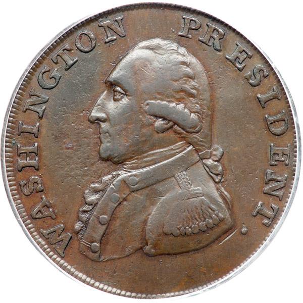 1793/2 Washington Ship Halfpenny with Lettered Edge Breen-1225. PCGS graded EF-45. Attractive glossy chocolate brown with darker steel toning on the highpoints. No defects other than some tiny low spots in the field before the mouth caused by specks of debris on the die. MDS. The 3 over 2 overdate feature is still clearly visible and the reverse die displays obvious swelling (as usual). Nice for the grade. The lettered edge is noted on the PCGS label.