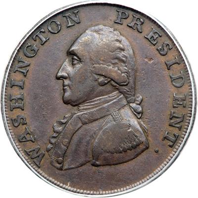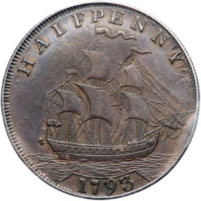 1793/2 Washington Ship Halfpenny with Lettered Edge Breen-1225. PCGS graded AU-58. Glossy chocolate and steel brown, a shade or two lighter in the protected areas around the legends. No spots or stains. The only notable mark is a shallow planchet flake in the field behind the head. MDS with obvious swelling on the reverse. The undertype 2 is no longer visible due to die wear, but the date and legends remain bold. Pop 8; 8 finer.