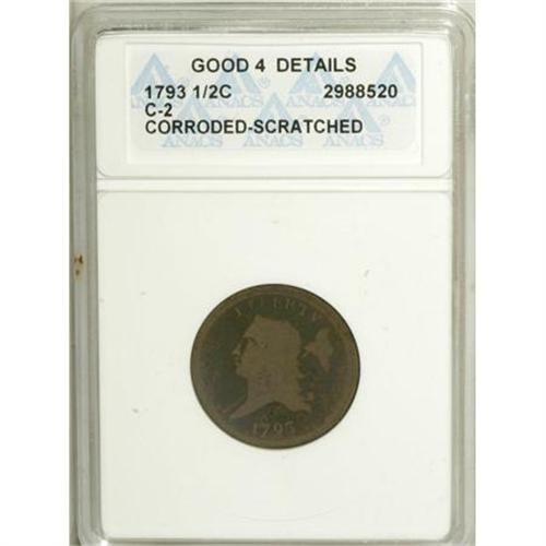 <B>1793 1/2 C --Corroded, Scratched--ANACS. Good 4 Details.</B></I> C-2, B-2, R.3. The granular ebony fields contrast with the tan-brown devices. The portrait has myriad wispy marks from verdigris removal. The reverse rim has a small nick at 5:30. EAC 3.<BR><BR><b>Shipping:</b> Coins & Currency (<a target="_blank" href="http://www.heritageauctions.com/common/shipping.php">view shipping information</a>)