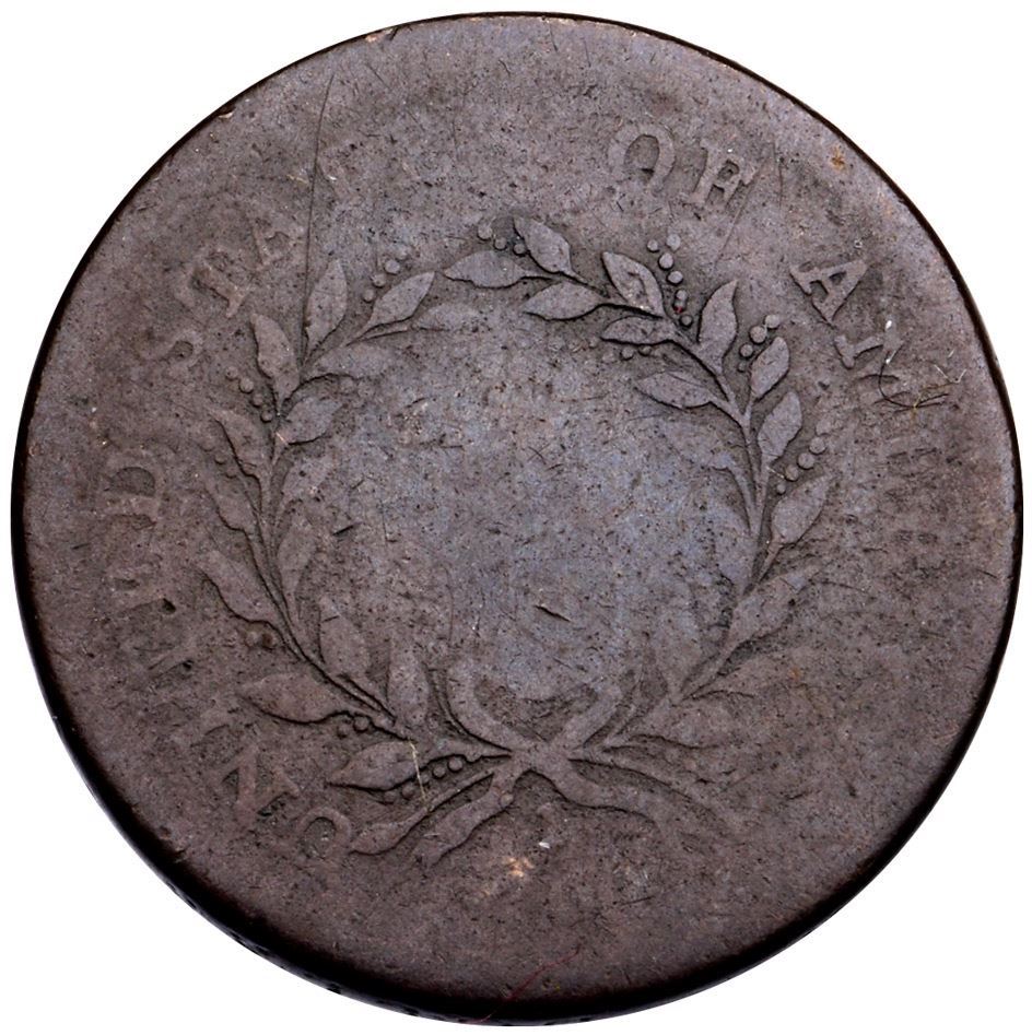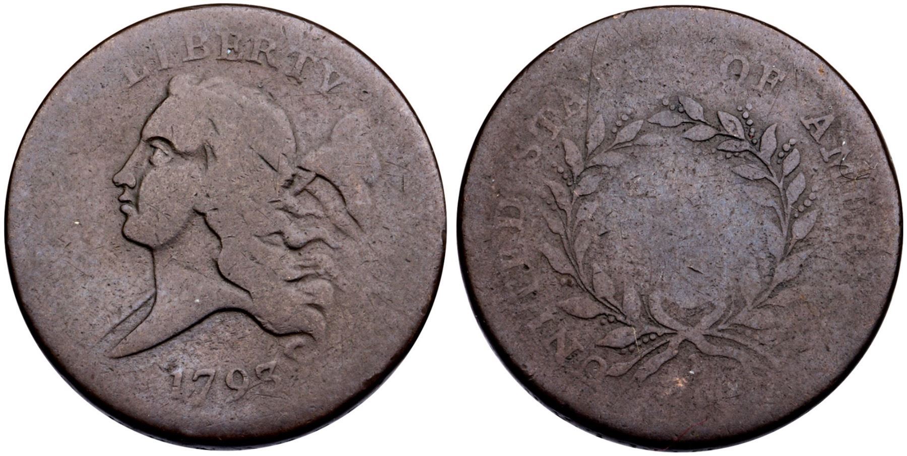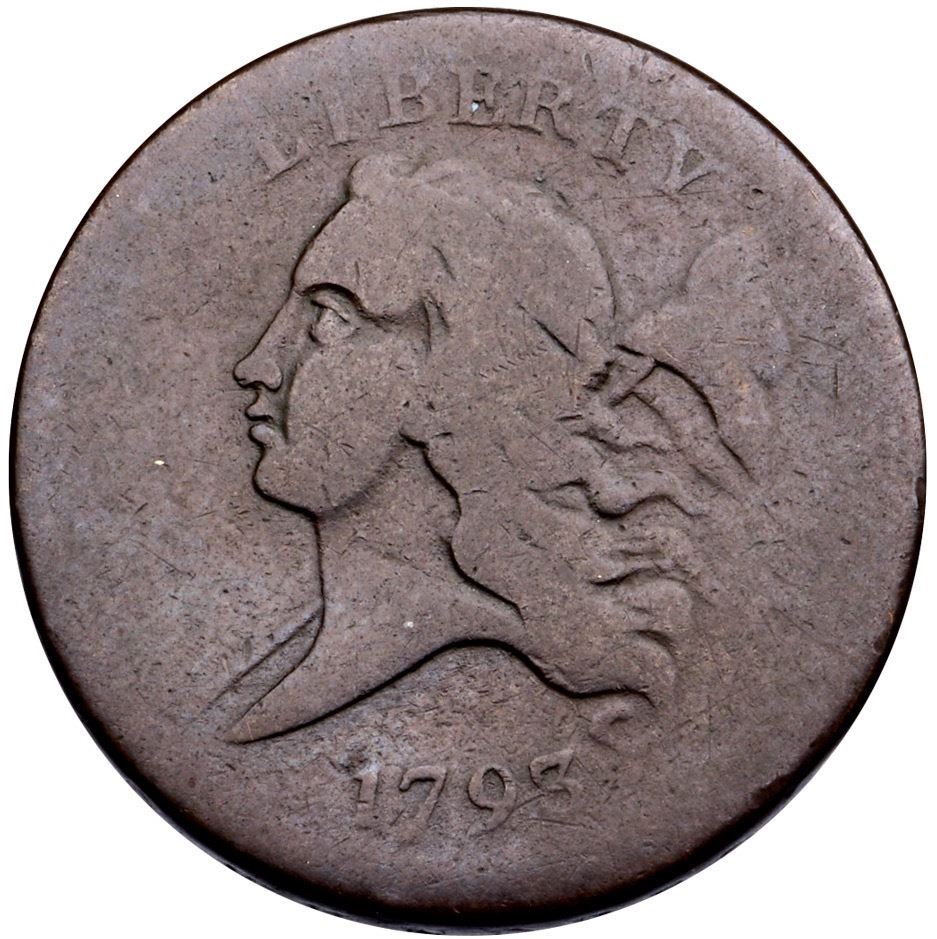 1793 C-1 R-3+ VG7Attractive rather glossy dark chocolate brown. Only the most trivial of marks, the most notable is a faint hairline scratch through the second T in STATES. Otherwise choice for the grade with smooth, hard surfaces. HALF CENT and ICA in AMERICA are gone, but the remaining legends are readable and date is strong. Manley State 2.0Certificate Number: Pedigree: Ex; Don Weinzapfel- Doug Bird 2/8/2008 - Bob Kebler Collection