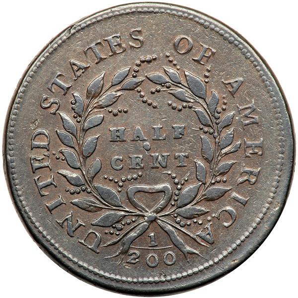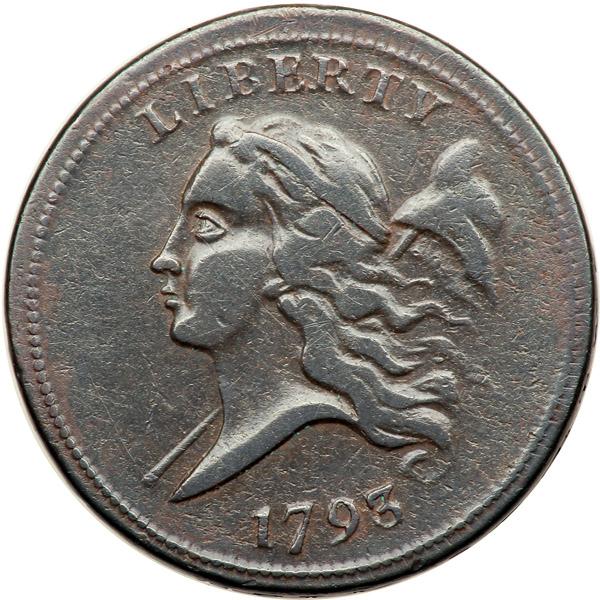 1793 C-2 R3 VF25. Frosty dark steel brown with lighter brown and tan toning in the most-protected areas. The surfaces are excellent but not perfect as there are microscopic pre-striking planchet chips in the obverse fields, mostly behind the portrait. No hint of corrosion or verdigris. The only contact marks are a small pinprick just right of the D in UNITED, a barely visible rim bruise at the adjacent E, and a small mark on the rim over the second T in STATES. A tiny planchet flake at the border beads below the fraction can also help identify this piece. Nicely struck EDS, Manley state 1.0 (the only known die state for this variety), with the reverse rotated 30 degrees clockwise from a head-to-foot orientation. The obverse is positioned slightly off center to the bottom and the reverse is a bit off to the upper left, but the border beads are complete around both sides. Another very attractive, well balanced 1793 half cent from this high-quality collection. Weight 114.8 grains.