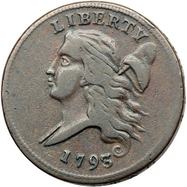 1793 C-3 R3 F15. Very attractive glossy chocolate brown with slightly lighter chocolate toning in protected areas on both sides. The planchet is smooth and the surfaces are virtually flawless. The best identifying marks are a tiny rim nick at TE in STATES and a barely visible rim bruise at the E in AMERICA, but these imperfections are trivial. The eye appeal of this piece is truly exceptional for the grade. MDS (there are no significantly different die states for this variety). Struck very slightly off center to K-9 and the reverse is rotated 10 degrees clockwise from a perfect head-to-foot die orientation. Noyes photo #73600. Weight 102.0 grains.