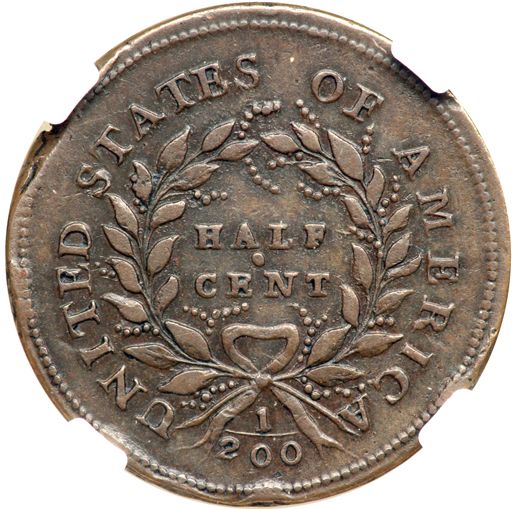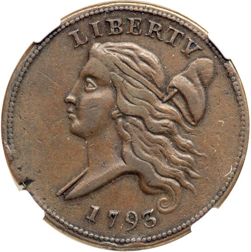 1793 C-3 R3 Liberty Cap NGC graded XF details, rim damage. Attractive glossy light to medium chocolate brown with smooth surfaces. No corrosion or verdigris, only a few marks. The "Rim Damage" mentioned by NGC is a planchet flaw (incomplete planchet mint error) left of the bust tip. This defect was created when the planchet was cut too close to the ragged end or edge of the planchet strip, and it affects perhaps a dozen of the border beads on both sides. Otherwise the only marks are three small rim bumps on each side, including two under the date, one left of the neck, two more at the bottom of the reverse, and one more at TE in UNITED. Nicely struck EDS. Perhaps this one would be better served in a slab with a "Mint Error" label. Our grade is VF35 sharpness net VF25.