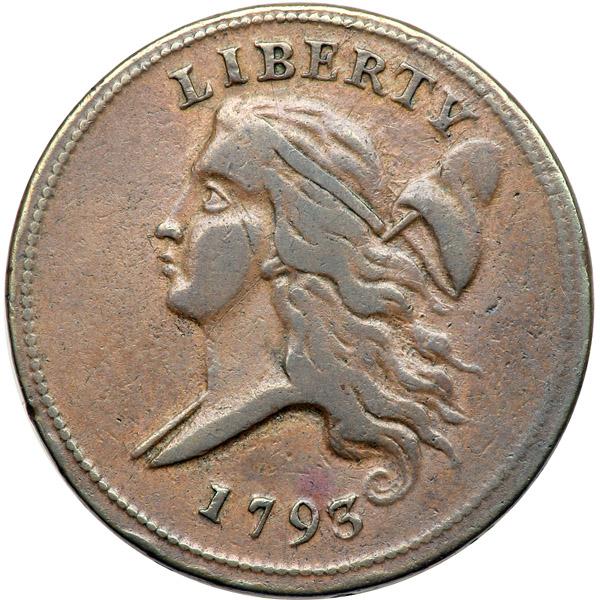 1793 C-4 R3 VF25. Beautiful glossy medium brown with darker steel brown and chocolate toning on the devices. A faint area of reddish brown toning shows over the 93 in the date. The only signs of contact are a thin, light diagonal nick high on the cheekbone, a couple nearly imperceptible rim bruises off the bust tip, and a small rim nick at the N in UNITED. E-MDS, Manley state 1.0 late. The tiny rust lump on the top of the 7 has not formed. The reverse is very slightly misaligned to K-5 but the designs are not affected. The dies are aligned perfectly head-to-foot. Weight 105.1 grains. Removed from a PCGS slab graded VF30 (old green PCGS label included, #1000.30/5224206).