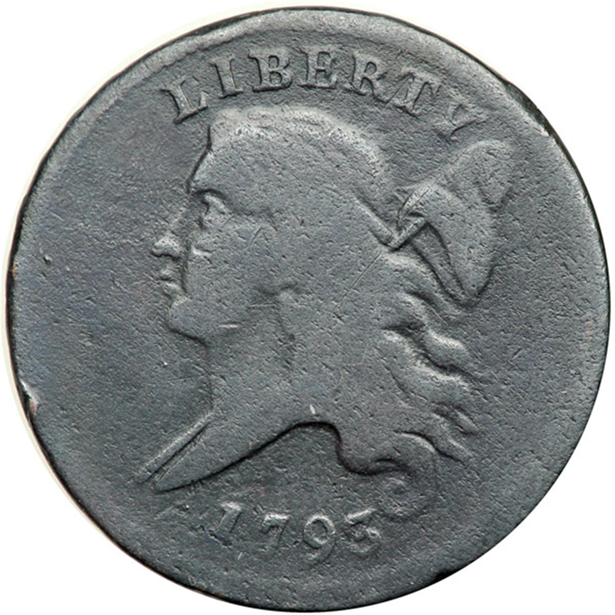 1793 C-4 R3 VG7. Very slightly sharper but there is a dull pinch on the rim left of the fraction. The only additional marks are a minor rim nick before the neck and a very light rim bruise at IB in LIBERTY. The planchet is covered with microscopic porosity but still displays a decent amount of gloss. Dark grayish steel. LDS, Manley state 2.0, showing a tiny lump resting on top of the 7. The date and legends are complete and clear. Removed from an ANACS slab graded VG8 (ANACS label included, #895206). Weight 101.6 grains.