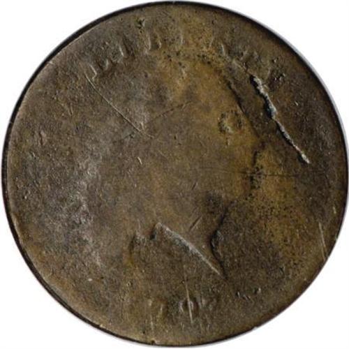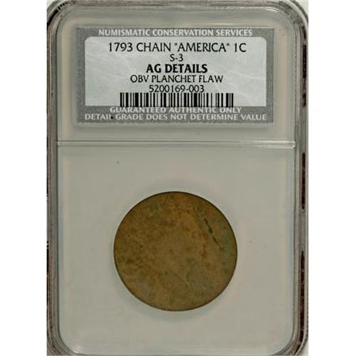 <B>1793 Chain 1C AMERICA--Obverse Planchet Flaw--NCS. AG Details.</B></I> S-3, B-4, Low R.3. Medium tan surfaces display most of the central obverse device, including Liberty's eye, and all of the chain, ONE CENT, and the fraction. The date and LIBERTY are weak, and all of AMERICA shows. A linear planchet flaw is visible in the upper right obverse field. EAC 3.<BR><BR><B>Coin Engraver:</B> Henry Voigt<BR><BR><b>Shipping:</b> Coins & Currency (<a target="_blank" href="http://www.heritageauctions.com/common/shipping.php">view shipping information</a>)