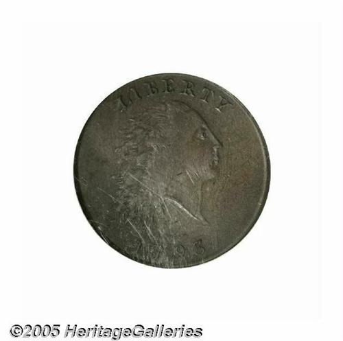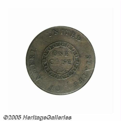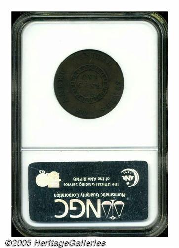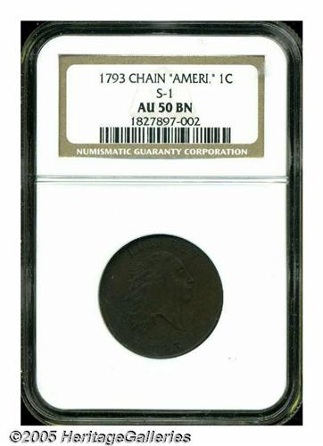 <B>1793 Chain<1C> AMERI. AU50 NGC.</B></I> S-1, R.4. Presumably, the engraver laid out AMERICA last, and realized that the legend would appear unbalanced unless the nation's name was abbreviated. The unique reverse legend identifies this variety as the first Cent issue struck at the first Philadelphia Mint. AMERICA is spelled out in full on the only other known Chain Cent reverse die, used to strike Sheldon-2, 3, 4, and NC-1.<BR>This imposing representative displays most of the fine details within Liberty's hair, and all other design elements and legends are bold. The strike is even and well centered. Chocolate-brown in color with hints of slightly deeper mahogany toning about the letters and within the chain links. There are four faint, thin, and parallel roller marks on the reverse; these are as made and were on the planchet prior to the strike. Only three pinscratches are found, these are on the cheek, the forehead, and the field near the mouth. No other marks are present. The edges and fields are smooth and attractive.<BR>An old collector's paper envelope, inscribed "1793 Chain Ameri" accompanies the lot, as does a small gray and gold cardboard box in which the Cent may have reposed for many years. Population: 1 in 50, 2 finer (6/05).<BR><I>Ex: Hogan Pond Collection (American Numismatic Rarities, 3/05), lot 1120, which realized $40,250. The ANR cataloger suggests the piece may have been in Barney Bluestone's 9/40 sale as lot 1024.</B></I>