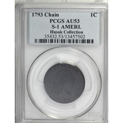 <B>1793 Chain 1C AMERI. AU53 PCGS. S-1, B-1, R.4. </B></I> <B>Bland XF40; tied for CC-11. Noyes VF35; CC-12. Photo #33333. Our EAC Grade XF40.<BR><BR>Equivalents.</B></I> Crosby-Levick 1A; Frossard 1, first reverse; Proskey 1; Doughty 1; Crosby 1-A; McGirk 1-A, 1-G; EAC 1; <I>Encyclopedia</B></I> 1632; PCGS #1340.<BR><B><BR>Variety.</B></I> Widest date of all Chain cents. Legend abbreviated AMERI. The obverse appears on S-1 and S-2. The famous Abbreviated Reverse die was only used for S-1, taken out of service when a large piece of the die broke away over TAT. The edge of all the Chain cents consists of a Vine and Bars design, as on most of the Wreath cents. At about the time of the Civil War, this edge was commonly called "Stars and Stripes." A continuous chain of 15 links appears on the reverse, one for each state at the time (Kentucky became the 15th state in 1792). The public disapproved of the initial design concept intended to represent unity of the country, feeling that the chain suggested slavery.<BR><BR><B>Surfaces. </B></I>Excellent surfaces with the sharpness slightly finer than the net grade. Both sides have smooth steel-brown and dark olive color with only the slightest handling marks expected for the grade. A faint scratch across the neck into the hair and another at the chin are the only visible provenance markers, with a few fainter scratches and other blemishes mostly hidden in the devices. Traces of cartwheel luster remain on both sides.<BR><BR><B>Die State III.</B></I> This piece represents an intermediate die state with faint clash marks below the bust truncation, but no evidence of the die crack that eventually forms through the tops of TATE. Aspects of this piece seem to meet Breen's criteria of different die states recorded in his <I>Large Cent Encyclopedia</B></I>. While the clash marks of Breen's Die State III are faintly visible on the obverse, there is no indication of the die bulge over the U on the reverse, recorded for State II.<BR><BR><B>Appearances.</B></I> The obverse and reverse are illustrated in Noyes (2006).<BR><BR><B>Census.</B></I> Several high-grade examples of the Chain AMERI variety are known, including two Mint State pieces and four others that grade AU. Breen often explained the existence of high grade coins by stating they were saved as the first of their kind. No documentation is known to support such a claim. Just seven of the top 15 pieces were known prior to 1900.<BR><BR><B>Commentary.</B></I> Most numismatists consider the Chain AMERI. to be the first variety struck, and therefore the first American coin produced at the new Philadelphia Mint. Sheldon wrote in <I>Early American Cents</B></I>: "This coin is in strong demand at all times, and the high value arises in part from the fact that it is the first coin struck for circulation at the U.S. Mint." His comments are equally valid today, nearly 60 years after he wrote them. Although considered just Rarity-4, with 150 to 200 examples known, the Chain AMERI. is hard to locate in higher grades due to a typical weak obverse, quickly affected by wear. Sheldon also noted that older cent collectors sometimes called this the "weak obverse" variety. It is unknown who was the first to identify the Chain AMERI. cent as a new variety, although it was clearly discovered before publication of the Crosby-Levick plate in 1869.<BR><BR>The history of large cent collecting dates back to at least 1858, when Edward Cogan conducted a small sealed bid sale of 77 large cents. Although he did not publish the results until 1862, it is clear that there were several active collectors in the late 1850s. The 77 pieces realized a total of $128.68, for an average of $1.67 each. While seeming unimpressive today, the results were astonishing at the time.<BR><BR>In the 1860s some numismatists discouraged collecting these "insignificant" pieces. In the introduction to his <I>Monographs</B></I> reference, John Adams quotes an 1865 address by Dr. Winslow Lewis, president of the Boston Numismatic Society, to the members: "Are we not somewhat degenerate at this present time in our Numismatic pursuits? Will the possession of fifty or sixty cents from the first coinage to this year, a series not certainly strikingly artistic nor elegantly suggestive, be called a lofty pursuit? Let us ... do all we can to discourage the folly of collecting worthless pieces of metal, whose sole value is their scarcity." Adams comments that the Boston society would soon devote entire evenings to large cents. Die variety references for 1793 and 1794 large cents were published in 1869, and critics were silenced.<BR><BR> Prior to the establishment of the Mint in Philadelphia, coinage in circulation consisted of a mixture of Colonial issues and foreign coins. Gold and silver coins were primarily issues from England, France, Spain, and Portugal, while copper coins included issues from those countries, as well as various state coinage issues and private tokens. As there was no standard coinage, the system created a nightmare for bankers, merchants, and consumers. Gold and silver issues were accepted at weight, based on their approximate content, requiring each merchant to test the pieces and weigh them.<BR><BR>David Rittenhouse submitted an assay report to Congress on January 7, 1793 (reprinted in American State Papers), indicating the content of various gold and silver coins then in common circulation. David Ott conducted the actual assay work, indicating that Spain used the lowest quality gold and Portugal, the highest. Similar assays were conducted periodically for many years, as long as various world coinage remained in circulation. Although weighing was still necessary, those assays lessened the need to test individual pieces.<BR><BR><B>Provenance.</B></I> <I>Purchased in 1941 by J.S. Gensheimer (Stack's, 2/1951), lot 396, $240; Willard C. Blaisdell; J.J. Teaparty (1976); Ed Hipps; Dean Oakes; Julian Leidman (7/1994); John B. MacDonald; Denis W. Lorin