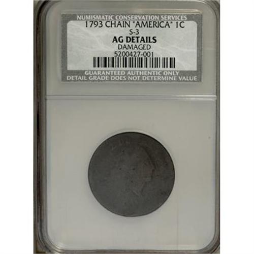 <B>1793 Chain 1C AMERICA--Damaged--NCS. AG Details.</B></I> S-3, B-4, Low R.3. The reverse has four equidistant small cuts on the rim. The obverse has a few minor rim dings and a subdued, shallow scrape above the ear. The chain is clear, Liberty is nicely outlined, and partial legends are present, although the date is worn smooth. EAC 1.<BR><BR><b>Shipping:</b> Coins & Currency (<a target="_blank" href="http://www.heritageauctions.com/common/shipping.php">view shipping information</a>)