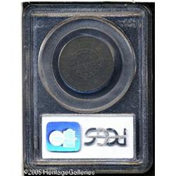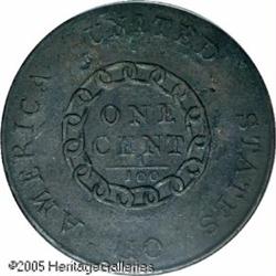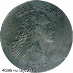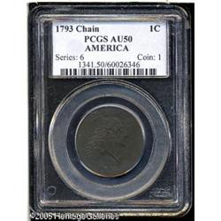 <B>1793 Chain 1C AMERICA AU50 PCGS.</B></I> S-3, R.3. The Chain Cents were the first coins produced by the fledgling United States Mint in Philadelphia, and were struck during the first two weeks of March 1793. Total mintage was 36,103 coins, and this mintage was distributed across five die marriages. The first of those was the now-famous Chain AMERI cent with the legend abbreviated for now unknown reasons. After that variety, a second reverse die was completed with AMERICA spelled out in its entirety. The public, those few that actually saw these coins, was not pleased with the design, and the new Wreath Cents were soon put into production.<BR> The obverse had a representation of Liberty, facing right, with her hair free flowing and intricately detailed. Above, the word LIBERTY was required by law, as was the date, below the bust. The reverse design included the statutory legend, UNITED STATES OF AMERICA, with a continuous chain of 15 links, representing the 15 states that were then part of the Union. Inside the chain, the denomination is expressed verbally as ONE CENT and also numerically as 1/100. There is little doubt that the original design was meant to express unity with the chain of 15 links unbroken. Some now believe that objections to this design detail were due to its representation of slavery.<BR> At the time these coins were produced, the Mint had plenty of copper available, from three lots received by the Mint during the last four months of 1792. A total of 6,345 pounds of copper were received by the Mint from three different suppliers, including Henry Voigt, James and Shoemaker, and Gustavus and Hugh Colhoun. This amount of copper was enough to produce over 200,000 large cents, plenty for the entire mintage of 1793 large cents and some of those dated 1794.<BR> This example is sharply detailed on both sides, with greenish-steel surfaces and evidence of light corrosion on both sides. Traces of light green corrosion may be seen on the reverse. The surfaces are otherwise quite hard, and are splashed with light orange, deep red, and steel brown color. Struck from a late die state with heavy clash marks near Liberty's face and below the bust truncation. Examples in such a late die state are seldom encountered. This is an important opportunity for the advanced collector. Lot:5100