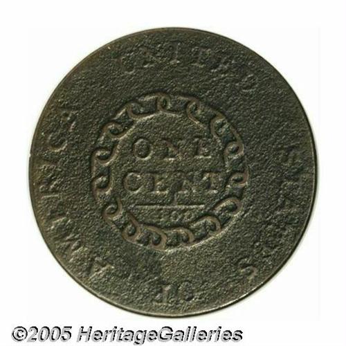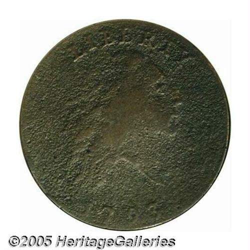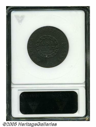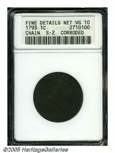 <B>1793 Chain<1C> AMERICA--Corroded--ANACS. Fine Details, Net VG10.</B></I> S-2, High R.4. The rarest Chain Cent die marriage, excluding the uncollectible NC-1. All legends are clear on this important early copper type coin. Liberty's profile is nicely defined. Dark brown in color and uniformly porous, the surfaces are unmarked aside from two unimportant obverse rim dings are at 7:30 and 8:30.