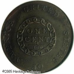 <B>1793 Chain 1C  AMERICA--Corroded--ANACS. XF Details, Net VF20.</B></I> S-2, High R.4. Sheldon-2 has the widest date of the Chain Cent obverses, and is also the rarest Chain Cent variety except for the extremely rare NC-1. Of course, any Chain Cent with the sharpness of the present piece is noteworthy. For most survivors of the variety, the date and UNITED STATES OF AMERICA are hardly legible. On this piece, however, Liberty's hair tresses are exquisitely rendered and the peripheral legends bold. Most of the piece has smooth, light brown color. However, the borders have areas of rough surface, notably on the obverse between 3 and 6 o'clock and 7 to 10 o'clock. A faint and relatively unimportant pinscratch is above Liberty's cheekbone, other lesser and inconspicuous marks are found upon close inspection on the neck and below the bust. An affordable piece for the collector who desires a highly detailed example of this historic early type.    Lot:5099