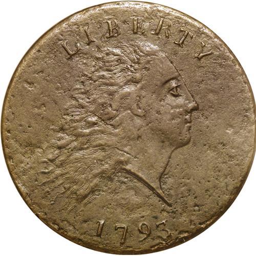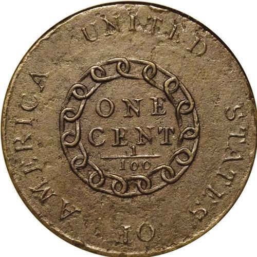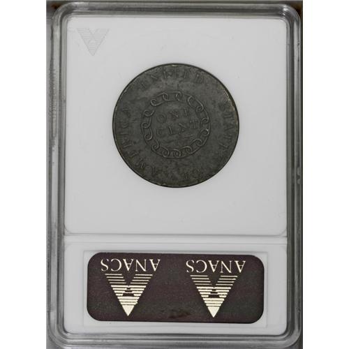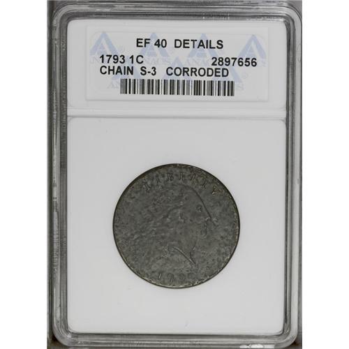 <B>1793 Chain<1C> AMERICA--Corroded--ANACS. XF40 Details.</B></I> S-3, B-4, Low R.3. The popular "Leaning R" variety, although others identify the variety by the date spacing of "1 7 93." Sheldon-3 is not especially rare as a die variety, but most survivors exhibit heavy wear and porosity. Often, the portrait is visible only as a ghostly outline, while all that remains of the reverse is the chain. Attribution must be made from what fragments of the legend emerge once the piece is bathed with light. The present piece, however, has full, sharp legends, and Liberty's hair and eye retain most of their original detail. The medium brown surfaces are faintly granular and lightly pitted, but this is also an improvement over the rough, oxidized texture often encountered. Marks are limited to a pair of minor rim nicks at 1 and 7 o'clock on the reverse. EAC 15.<BR><I>From The Antigo Collection, Part Two.</B></I>