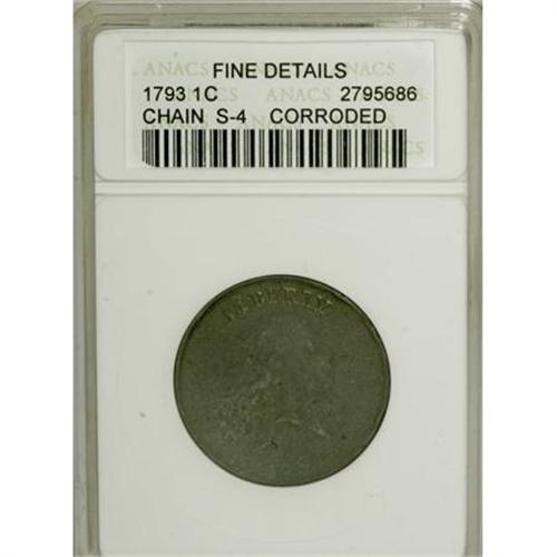 <B>1793 Chain 1C Periods--Corroded--ANACS. Fine Details.</B></I> S-4, B-5, R.3. This dark brown cent has bold legends aside from the date, which is nonetheless legible. The reverse is moderately granular, and the obverse is slightly rougher. A glass locates minor marks near the bust tip and along the right obverse rim. EAC 4.<BR><BR><B>Coin Engraver:</B> Henry Voigt<BR><BR><b>Shipping:</b> Coins & Currency (<a target="_blank" href="http://www.heritageauctions.com/common/shipping.php">view shipping information</a>)