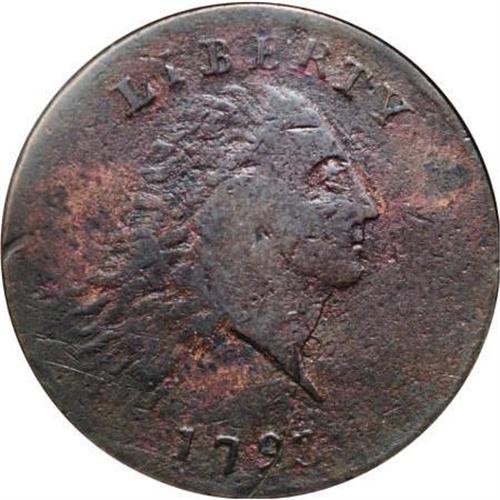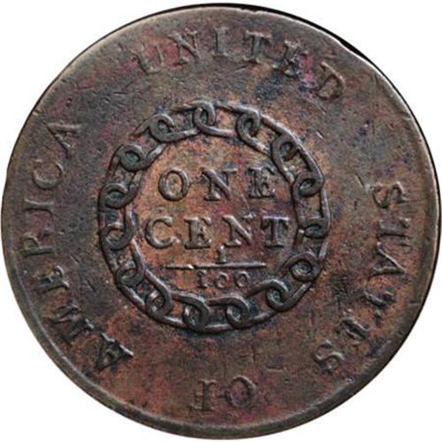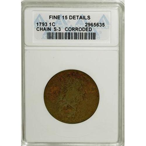 <B>1793 Chain 1C AMERICA--Corroded--ANACS. Fine 15 Details.</B></I> S-3, B-4, Low R.3. Straight bust line with a large and high R in LIBERTY. The reverse has AMERICA spelled in its entirety. A combination of minor surface marks, original planchet marks, and later corrosion are combined on the surfaces, yet this desirable piece still retains excellent eye appeal. Some lighter reddish-tan suggests it may have been recolored. EAC 10.<BR><I>From The Beau Clerc Collection.</B></I><BR><BR><B>Coin Engraver:</B> Henry Voigt<BR><BR><b>Shipping:</b> Coins & Currency (<a target="_blank" href="http://www.heritageauctions.com/common/shipping.php">view shipping information</a>)