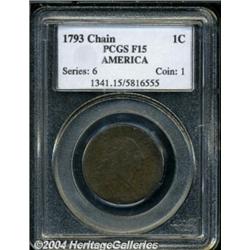 <table><tbody><tr><td><table> <TR><TD width="100%"><TABLE cellSpacing=1 cellPadding=3 width="100%" border=0><TBODY><TR><TD width="100%" bgColor=#79735c><FONT face=arial color=#ffffff size=3><B>Description</B> </FONT></TD></TR><TR><TD width="100%" bgColor=#ffffff><FONT face=arial size=2><B>1793 Chain 1C AMERICA Fine 15 PCGS.</B></I> S-3, Low R.3. The 17 in the date is more widely spaced than the 93. UNITED is faint, while the remaining legends are legible. The chain device, denomination, and fraction are bold, and Liberty is well outlined and retains some details of her eye. A charcoal-brown representative with mildly granular surfaces and a pair of relatively deep pinscratches that originate near nine o'clock and ten o'clock, respectively, on the obverse rim, and travel inward toward the center of the coin. Liberty's cheek and the right obverse field have a few noticeable abrasions. The dies are slightly rotated counterclockwise. </FONT></TD></TR></TBODY></TABLE></TD></TR></TBODY></TABLE><BR><A name=PricesRealized></A><TABLE cellSpacing=0 cellPadding=0 width="100%" bgColor=#000000 border=0><TBODY><TR><TD width="100%"><TABLE cellSpacing=1 cellPadding=3 width="100%" border=0><TBODY><TR><TD width="100%" bgColor=#79735c><A name=PR><FONT face=arial color=#ffffff size=3><B>Previous Prices from Heritage Auctions</B> </FONT></A></TD></TR><TR><TD bgColor=#f6f6ed><TABLE cellSpacing=0 cellPadding=0 width="100%" border=1><TBODY><TR><TD align=middle width="33%"><B>Date</B></TD><TD align=middle width="33%"><B>Service</B></TD><TD align=middle width="33%"><B>Price</B></TD></TR><TR bgColor=whitesmoke><TD width="33%"><B>08/13/1999</B></TD><TD width="33%">ANACS</TD><TD width="33%">$4,600.00</TD></TR></TBODY></TABLE></TD></TR><TR><TD bgColor=#ffffff><FONT face=arial size=1 ?>PLEASE NOTE: All prices realized reflect the final hammer price PLUS the buyer's premium in auctions that charge a buyer's premium. Each item has a notation at the top of the listing indicating whether that lot included a buyer's premium. Example: A item that sells with a final hammer price of $100 and a 20% buyer's premium will display with a price realized of $120. All information listed is intended to be as accurate as possible, but errors are possible. Please use this guide carefully and inform us of any inaccuracies. </FONT></TD></TR></TBODY></TABLE></TD></TR></TBODY></TABLE><BR><TABLE cellSpacing=0 cellPadding=0 width="100%" bgColor=#000000 border=0><TBODY><TR><TD width="100%"><TABLE cellSpacing=1 cellPadding=3 width="100%" border=0><TBODY><TR><TD width="100%" bgColor=#79735c colSpan=6><FONT face=arial color=#ffffff size=3><B>Price Guide*</B> </FONT></TD></TR><TR bgColor=#f6f6ed><TD align=middle><B>Grade</B> </TD><TD align=middle><B>Coin World<BR>(Trends)</B> </TD><TD align=middle><B>Numismedia<BR>Retail</B> </TD><TD align=middle><B>Numismedia<BR>Wholesale</B> </TD><TD align=middle><B>Coin<BR>Universe</B> </TD><TD align=middle><B>Heritage<BR>Value Index</B> </TD></TR><TR bgColor=#ffffff><TD align=middle>12</TD><TD align=right>$10,000.00</TD><TD align=right>---</TD><TD align=right>$5,450.00</TD><TD align=right>$7,000.00</TD><TD align=right>$6,516.67</TD></TR><TR style="FONT-WEIGHT: bold" bgColor=#cccfdd><TD align=middle>15</TD><TD align=right>---</TD><TD align=right>---</TD><TD align=right>---</TD><TD align=right>---</TD><TD align=right>$8,177.08</TD></TR><TR bgColor=#ffffff><TD align=middle>20</TD><TD align=right>$16,000.00</TD><TD align=right>---</TD><TD align=right>$8,925.00</TD><TD align=right>---</TD><TD align=right>$10,944.44</TD></TR><TR bgColor=#ffffff><TD colSpan=6><FONT size=1>*All information listed is intended to be as accurate as possible, but errors are possible. No item may be returned or refused based on this information which is provided as a service to our customers. You should contact each pricing source directly to determine the accuracy of this information. </FONT></TD></TR></TBODY></TABLE></TD></TR></TBODY></TABLE><BR><TABLE cellSpacing=0 cellPadding=0 width="100%" bgColor=#000000 border=0><TBODY><TR><TD width="100%"><TABLE cellSpacing=1 cellPadding=3 width="100%" border=0><TBODY><TR><TD width="100%" bgColor=#79735c><FONT face=arial color=#ffffff size=3><B>Population Guide</B> </FONT></TD></TR><TR bgColor=#ffffff><TD align=middle><!-- Begin Output of Population Grid--><TABLE cellSpacing=0 cellPadding=0 width="100%" border=0><TBODY><TR><TD vAlign=center><TABLE cellSpacing=0 width="100%" border=1 cellsadding="3"><TBODY><TR><TD vAlign=center><TABLE cellSpacing=0 cellPadding=3 width="100%" border=1><TBODY><TR><TD vAlign=center align=middle bgColor=#f0f1e8 colSpan=2 <CENTER><FONT face=Arial size=2><B>PCGS Pop </B></FONT><CENTER></CENTER></TD><TD vAlign=center align=middle bgColor=#f0f1e8 colSpan=2><CENTER><FONT face=Arial size=2><B>NGC Pop</B></CENTER></FONT></TD></TR><TR><TD vAlign=center><FONT face=Arial size=2>(15)</FONT> </TD><TD vAlign=center align=right><FONT face=Arial size=2>17</FONT> </TD><TD vAlign=center><FONT face=Arial size=2>(15)</FONT> </TD><TD vAlign=center align=right><FONT face=Arial size=2>4</FONT> </TD></TR><TR><TD vAlign=center><FONT face=Arial size=2>(>15)</FONT> </TD><TD vAlign=center align=right><FONT face=Arial size=2>99</FONT> </TD><TD vAlign=center><FONT face=Arial size=2>(>15)</FONT> </TD><TD vAlign=center align=right><FONT face=Arial size=2>49</FONT> </TD></TR></TBODY></TABLE></TD></TR></TBODY></TABLE></TD></TR></TBODY></TABLE><!-- End Output of Population Grid--></TD></TR></TBODY></TABLE></TD></TR></TBODY></TABLE><BR><TABLE cellSpacing=0 cellPadding=0 width="100%" bgColor=#000000 border=0><TBODY><TR> <font color='#000000'><span style='background-color: #FFFFFF'><td bgcolor='#FFFFFE'> Important notice: Heritage usually auctions material at the rate of 200-250 lots per hour. On some occasions eBay Live bid software or the Internet may not be able to keep up with the pace of the auction. We recommend placing a realistic absentee bid now as insurance to avoid disappointment. Occasionally t