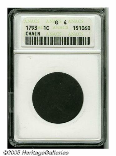 <B>1793 Chain<1C> AMERICA Good 4 ANACS.</B></I> S-3, Low R.3. UNITED and the bottom of the 7 in the date are faint, but the remainder of the legends are readable. The chain is bold, of course, and Liberty is fully outlined and has a clear eye and mouth. The dark surfaces are moderately granular, as expected of the grade, but the only detectable marks are a tiny nick on the reverse rim at 5:30 and a faded short pinscratch above the 1 in the date.