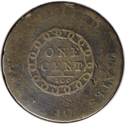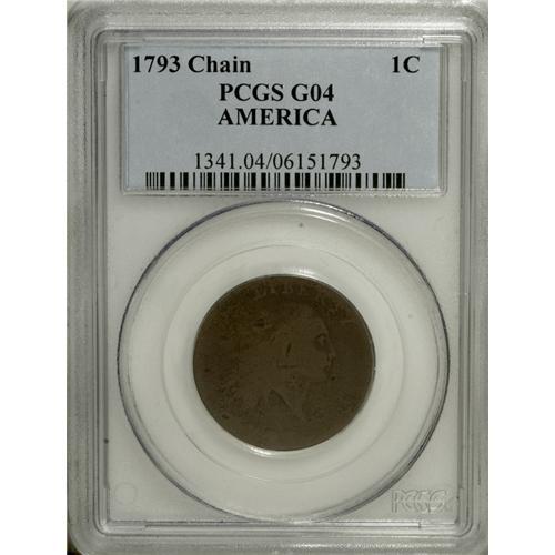 <B>1793 Chain 1C AMERICA Good 4 PCGS.</B></I> S-2, B-2, High R.4. Well worn with several pitted marks on each side and a shallow scratch on the obverse that extends from the upper left obverse field into Liberty's lower hair curls. The date and the peripheral legends are mostly worn away, with about half of the reverse legends still evident. EAC 3.<BR><BR><b>Shipping:</b> Coins & Currency (<a target="_blank" href="http://www.heritageauctions.com/common/shipping.php">view shipping information</a>)
