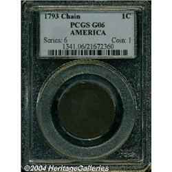 <B>1793 Chain<1C> AMERICA Good 6 PCGS.</B></I> S-2, High R-4. The Wide Date obverse. Medium, even brown toning is seen over both sides. The obverse design elements are weak, as is the peripheral reverse lettering, while the chain and denomination display relatively strong detail. The surfaces are minutely granular, and a few small surface marks and rim bruises are consistent with the grade. An acceptable example for a low grade early type set. <BR><BR><B>Important notice:</B> Heritage usually auctions material at the rate of 200-250 lots per hour. On some occasions eBay Live bid software or the Internet may not be able to keep up with the pace of the auction. We recommend placing a realistic absentee bid now as insurance to avoid disappointment. Occasionally the auctioneer may eliminate or reject an eBay Live bid, and the auctioneer may also reopen a lot after the close of the eBay live bidding (usually because we missed an audience bid), and may reject your bid even if it shows you as the winning bidder. By bidding via eBay Live, you agree that Heritage may award the lot to another bidder at its sole discretion under the circumstances described above or any other reasonable circumstances. Since eBay bids are not shown to us until we open the lot on the floor, we treat those bids just like floor bids. In most cases the floor responds before the eBay bid is presented to us, due to Internet lag time, so for consistency we have made it a policy that floor bids are always considered first over tie eBay live bids. Also please note that all Heritage lots purchased through eBay Live carry a 20% Buyer's Premium. Please make sure you read the Terms and Conditions before you bid.