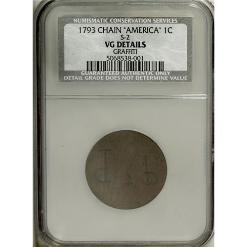 <B>1793 Chain 1C AMERICA--Graffiti--NCS. VG Details.</B></I> S-2, B-2, High R.4. The letters d and b and a curly line are engraved with some artistic skill over the obverse. The reverse has an engraved straight line using the same tool. Both sides exhibit myriad wispy hairlines. UNITED is faint and the date has worn smooth, but all other legends are clear to bold, and the light brown color is attractive. EAC 3.<BR><BR><b>Shipping:</b> Coin/Currency (<a target="_blank" href="http://www.heritageauctions.com/common/shipping.php">view shipping information</a>)