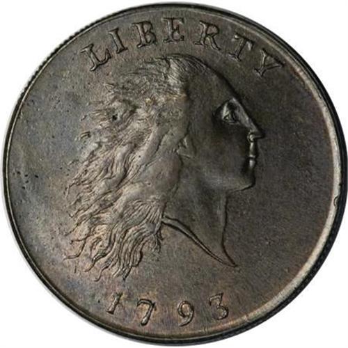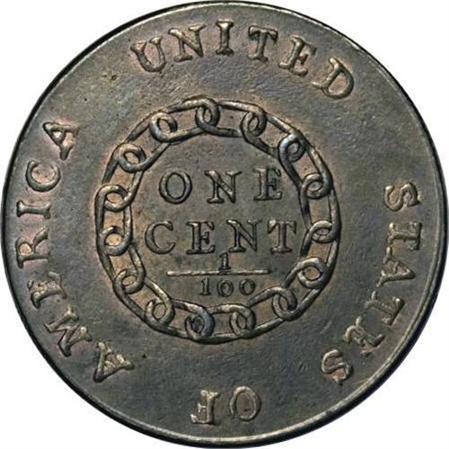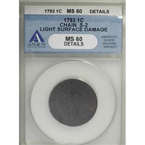 <B>1793 Chain 1C AMERICA MS60 Details, Light Surface Damage, ANACS. S-2, B-2, High R.4. </B></I> <B>Bland MS61; CC-1. Noyes AU50; tied for CC-6. Photo #35070. Our EAC Grade AU55.<BR><BR>Equivalents.</B></I> Crosby-Levick 1B; Frossard 1, second reverse; Proskey 2; Doughty 2; Crosby 1-C; McGirk 1-B; EAC 2; <I>Encyclopedia</B></I> 1633; PCGS #1341.<BR><B><BR>Variety.</B></I> Widest date of all Chain cents. Full legend, AMERICA. The obverse appears on S-1 and S-2. The reverse appears on S-2, S-3, S-4, and NC-1. The obverse die was resurfaced to remove clash marks, also diminishing the appearance of the die bulge that appeared during striking of the earlier S-1 coins.<BR><B><BR>Surfaces. </B></I>A remarkable Chain cent with lustrous medium olive color and considerable red on exceptional surfaces. The slightest smoothing of the surfaces are mentioned by ANACS. There is no trace of wear, but a blunt strike is described by Del Bland in his Condition Census, evident on the hair around the ear and on letters of the legend. According to the New Netherlands cataloger, one of America's greatest collectors described the appearance as "liquid fire" when he first saw this coin.<BR><BR><B>Die State II.</B></I> A late die state with clash marks visible in the obverse field. The earlier obverse clash marks from the S-1 were polished off the die, and production of the S-2 cents began. Soon, another die clashing occurred, and the late state S-2 cents appeared. Theoretically, early state examples of this die marriage could exist with clash marks from the AMERI. reverse.<BR><BR><B>Appearances.</B></I> The obverse and reverse are illustrated in Walter Breen's <I>Encyclopedia of Early United States Cents 1793-1814</B></I> and in Noyes (2006).<BR><BR><B>Census.</B></I> Del Bland lists this piece as finest known in his Census, followed by five pieces graded AU55 and one other graded AU50. Bill Noyes had apparently not seen this coin when his 1991 photographic study was published. In <I>United States Large Cents 1793-1814,</B></I> he listed this piece as finest known with a grade of MS60+. A number of years later, in <I>The Official Condition Census for U.S. Large Cents </B></I>and in<I> United States Large Cents 1793-1794</B></I>, he listed the coin as AU50 and tied for sixth finest known, based on his personal examination.<BR><BR>The disparity in grade between Del Bland and Bill Noyes results from differing opinions regarding the appearance of this piece. Noyes believes the coin may have been cleaned and recolored, while Bland suggests that the appearance is fully original. However, the bottom line is the opinion of the owner. Certainly Walter Husak likes this piece or he would not have it in his collection, and we are sure the new owner will be equally delighted.<BR><BR><B>Commentary.</B></I> When considering all varieties of Chain cents certified by both NGC and PCGS, the population figures suggest that 23 different pieces have been certified MS60 or finer. Comparing current Condition Census notes with population reports will show that only about a dozen Chain cents have legitimate claims to Mint State status in today's commercial grading environment.<BR><BR>Various proposals were presented for the establishment of a Mint in the United States or for the supply of coinage from overseas. Thomas Jefferson received a proposal from John H. Mitchell, who stated that he could furnish a supply of copper coinage of better quality and at less cost than anyone else in any country. Mitchell claimed that his coinage dies would be engraved by the finest artist in that line of work in Europe, that his coinage would be struck by a "fire engine," and that his process would strike the edge at the same time as the faces of the coin. Furthermore, his coinage would be produced of pure, unalloyed copper, wrapped and packed in casks ready for shipping, at the rate of 14 pence sterling per pound.<BR><BR>Based on specimens that Jefferson personally saw, he commented: "He [Jefferson] is, therefore, of opinion, that the undertaker, aided by that artist, and by his own excellent machines, is truly in a condition to furnish coin in a state of higher perfection than has ever yet been issued by any nation." However, Jefferson recommended that the coinage proposal be declined. "We lose the opportunity of calling in and re-coining the clipped money in circulation, or we double our risk by a double transportation. We lose, in like manner, the resource of coining up our household plate in the instant of great distress. We lose the means of forming artists to continue the works, when the common accidents of mortality shall have deprived us of those who began them."<BR><BR><B>Provenance.</B></I> <I>F.C.C. Boyd (1957); New Netherlands Coin Co. (Sale 50, 12/1957), lot 881, $1,350; Corrado Romano (Stack's, 6/1987), lot 145, $31,900; Martin Paul; Superior (1/1988), lot 50, $50,600; Martin Paul; Dr. Kenneth Baer; Auction '89 (David Akers), lot 1003, $88,000; American Rare Coin Fund, LP; Auction '90 (Superior), lot 1007, $132,000; Martin Haber; Heritage (10/1990), lot 453; later, Bowers and Merena (1/1993), lot 217; later, Superior; Spectrum Numismatics (9/1996)</B></I>.<BR><BR><B>Personality.</B></I> <B>Frederick C.C. Boyd</B></I> was born in New York City, on April 10, 1886, and died on September 7, 1958, in East Orange, New Jersey. Over many years he was employed in a variety of fields, beginning as an apprentice printer at age 13. He spent some time as a traveling salesman and an advertising manager before taking a managerial position with the Union News Company. Boyd was a vice president with Union News when he retired in 1946. He kept busy as a part-time coin dealer, conducting three auction sales including the 1922 ANA auction. He held Life Member number 5 in the ANA, was a life fellow of the ANS, and served as president and secretary-treasurer of the New York Numismatic Club over a period of many years. Boyd assembled an amazing collection, much