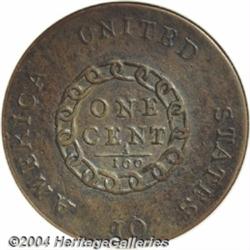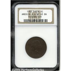 <B>1793 Chain<1C> AMERICA, Periods XF45 NGC.</B></I> S.4, High R.3. Further confirmation of Voigt as the engraver of the Chain cent dies was provided by Thomas Jefferson in a report to the Senate dated December 30, 1793. His report discussed the difficulty of finding qualified men to fill the posts of assayer and chief coiner, with these positions requiring a $10,000 security, which neither Albion Cox or Henry Voigt could provide. Therefore, only copper coinage could be produced in 1793. Jefferson noted: "The duties of this last office [chief coiner] have consequently been, hitherto, performed, and well performed, by Henry Voight, an artist of the United States, but the law requiring these officers to give a security, in the sum of 10,000 dollars each, neither is able to do it. The coinage of the precious metals has, therefore, been prevented, for sometime past, though, in order that the mint might not be entirely idle, the coinage of copper has been going on; the trust in that, at any one point of time, being of but small amount."<BR> Several years ago, Walter Breen suggested that the obverse die for this Sheldon-4 variety may have been engraved by someone other than Voigt. His reasoning was that the minute hair details were much differently treated than on the earlier dies. He speculated that this obverse may have been a sample die by Joseph Wright; however, there is no indication of payment to Wright for any such work. Harry Salyards indicated that this die may have been engraved by the same artist who prepared the Wreath cent dies, as there are stylistic similarities. The actual diesinker of the Wreath cents is not currently known, although it may have been Adam Eckfeldt or perhaps Henry Voigt with assistance from Adam Eckfeldt.<BR> The obverse has excellent medium brown surfaces with a light woodgrain pattern, while the reverse has darker steel and tan color. This is the popular Periods variety with small periods immediately following LIBERTY and the date, although on this example the period following the date is extremely weak. The surfaces are very slightly wavy across the lower half of the obverse. This is a late die state with a small triangular rim break near the cracks at the lower left obverse. <BR><BR><B>Important notice:</B> Heritage usually auctions material at the rate of 200-250 lots per hour. On some occasions eBay Live bid software or the Internet may not be able to keep up with the pace of the auction. We recommend placing a realistic absentee bid now as insurance to avoid disappointment. Occasionally the auctioneer may eliminate or reject an eBay Live bid, and the auctioneer may also reopen a lot after the close of the eBay live bidding (usually because we missed an audience bid), and may reject your bid even if it shows you as the winning bidder. By bidding via eBay Live, you agree that Heritage may award the lot to another bidder at its sole discretion under the circumstances described above or any other reasonable circumstances. Since eBay bids are not shown to us until we open the lot on the floor, we treat those bids just like floor bids. In most cases the floor responds before the eBay bid is presented to us, due to Internet lag time, so for consistency we have made it a policy that floor bids are always considered first over tie eBay live bids. Also please note that all Heritage lots purchased through eBay Live carry a 20% Buyer's Premium. Please make sure you read the Terms and Conditions before you bid. </span></font></tr></table></td></tr></table>