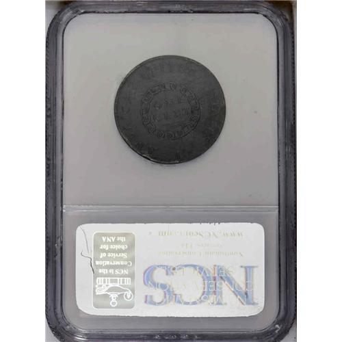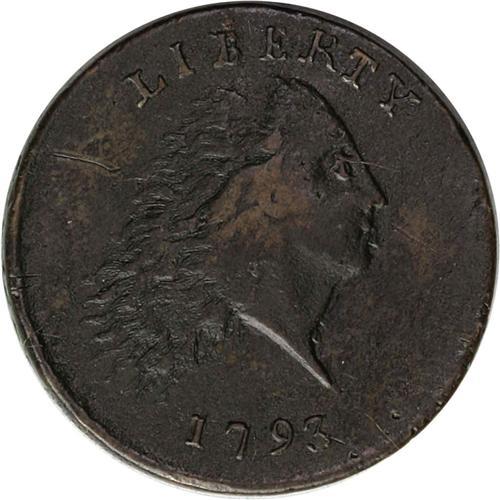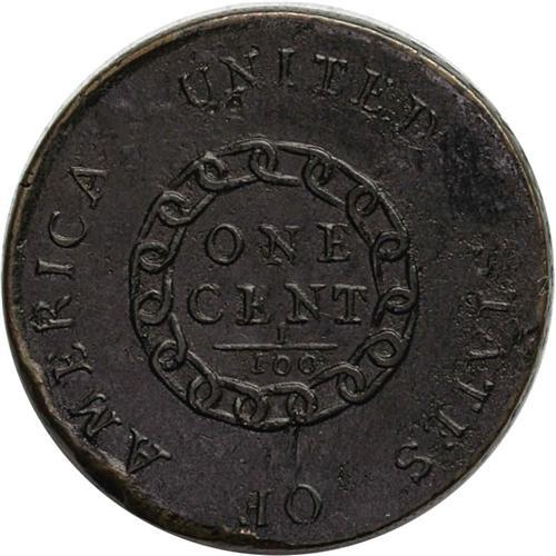 <B>1793 Chain<1C> AMERICA. S-3, B-4, Low R.3--Environmental Damage--NCS. AU Details. VG10 EAC.</B></I> Close Date, No Periods. Die State II. Light clash marks are visible in the fields. Sheldon-3 is clearly the most common of the Chain Cent varieties. This is an exceptionally well-detailed example, but it has numerous surface challenges. Both sides have ebony color with splashes of chestnut-brown on the obverse. The surfaces have light to moderate porosity, including some wavy areas that suggest minor tooling to remove the porosity. In addition, there are minor scratches on both sides, as well as myriad rim bruises, especially visible on the reverse. Additionally, the reverse rims show evidence of light filing to diminish the imperfections.<BR><I>Ex: Dill (10/1969).</B></I> Envelope Included.