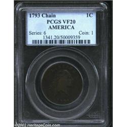 1793 Chain 1C AMERICA VF20 PCGS. S-3, Low R.3. The "Leaning R" variety, with the R in LIBERTY large,