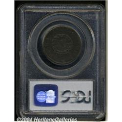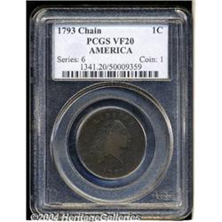 <B>1793 Chain<1C> AMERICA VF20 PCGS.</B></I> S-3, Low R.3. The "Leaning R" variety, with the R in LIBERTY large, high, and leaning to the right. The Chain cents were the first coins produced at the young Philadelphia Mint after construction was completed in 1792. Actual coinage had to wait until equipment was in place and other issues taken care of. Copper scrap had already been acquired during the latter months of 1792. Copper scrap on hand for coinage amounted to 6,345 pounds, enough to produced over 200,000 large cents. Once all was ready, a small coinage of 36,103 Chain cents was produced in late February and early March of that year with deliveries taking place during the first 12 days of March. Walter Breen stated that coinage halted for lack of blanks, suggesting that the available copper had not yet been made into planchets, or that much of it was used for other purposes. Although not applicable in 1793, some copper was necessarily used as alloy for silver and gold that was deposited over the next few years and beyond.<BR>The surfaces are deep brown overall with somewhat lighter brown accents over the devices. Numerous small abrasions are scattered about, as well as a few minor rim bruises on the reverse, but there is no evidence of porosity or corrosion, as often seen on these early copper coins. <BR><BR><B>Important notice:</B> Heritage usually auctions material at the rate of 200-250 lots per hour. On some occasions eBay Live bid software or the Internet may not be able to keep up with the pace of the auction. We recommend placing a realistic absentee bid now as insurance to avoid disappointment. Occasionally the auctioneer may eliminate or reject an eBay Live bid, and the auctioneer may also reopen a lot after the close of the eBay live bidding (usually because we missed an audience bid), and may reject your bid even if it shows you as the winning bidder. By bidding via eBay Live, you agree that Heritage may award the lot to another bidder at its sole discretion under the circumstances described above or any other reasonable circumstances. Since eBay bids are not shown to us until we open the lot on the floor, we treat those bids just like floor bids. In most cases the floor responds before the eBay bid is presented to us, due to Internet lag time, so for consistency we have made it a policy that floor bids are always considered first over tie eBay live bids. Also please note that all Heritage lots purchased through eBay Live carry a 20% Buyer's Premium. Please make sure you read the Terms and Conditions before you bid. </span></font></tr></table></td></tr></table>