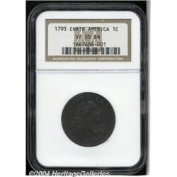 <B>1793 Chain<1C> AMERICA VF25 NGC.</B></I> S.3, Low R.3. Dies for the Chain cents were prepared by Henry Voigt who was the chief coiner at the mint. On February 9, 1795, Elias Boudinot reported to Congress on the state of the Mint, including "The present state and progress of the works." Much of his report was an answer to objections that the Mint was not producing enough coins to justify its existence. In this report, he stated: "The buildings were all to be completed before the works could be begun. The lots on which the same are built, from a principle of economy, were so restricted in size, that they are now found to be much too small, and so insufficient as greatly to hinder the several operations, and delay the business. It was also a considerable time before an engraver could be engaged, during which, the chief coiner was obliged to make the dies for himself, and yet the dies are subject to frequent failures by breaking. Great delays have also taken place for want of a refiner and melter, provision for such an office having been wholly omitted in the law instituting the mint, by which, the present stock of copper remains useless and unproductive." Boudinot's comments confirm the attribution of these dies to Henry Voigt. Not long after Boudinot's report, he was selected as the new Director of the Mint, a position he would hold for several years.<BR> This is a pleasing mid-grade Chain cent for the date or type collector. The surfaces have typical abrasions expected at this grade level, although none are severe. Pleasing medium brown color with good eye appeal. Sheldon-3 is the single most available Chain cent although it can hardly be considered common. The other four varieties are rarer still, with one of these being semi-unique. <BR><BR><B>Important notice:</B> Heritage usually auctions material at the rate of 200-250 lots per hour. On some occasions eBay Live bid software or the Internet may not be able to keep up with the pace of the auction. We recommend placing a realistic absentee bid now as insurance to avoid disappointment. Occasionally the auctioneer may eliminate or reject an eBay Live bid, and the auctioneer may also reopen a lot after the close of the eBay live bidding (usually because we missed an audience bid), and may reject your bid even if it shows you as the winning bidder. By bidding via eBay Live, you agree that Heritage may award the lot to another bidder at its sole discretion under the circumstances described above or any other reasonable circumstances. Since eBay bids are not shown to us until we open the lot on the floor, we treat those bids just like floor bids. In most cases the floor responds before the eBay bid is presented to us, due to Internet lag time, so for consistency we have made it a policy that floor bids are always considered first over tie eBay live bids. Also please note that all Heritage lots purchased through eBay Live carry a 20% Buyer's Premium. Please make sure you read the Terms and Conditions before you bid. </span></font></tr></table></td></tr></table>