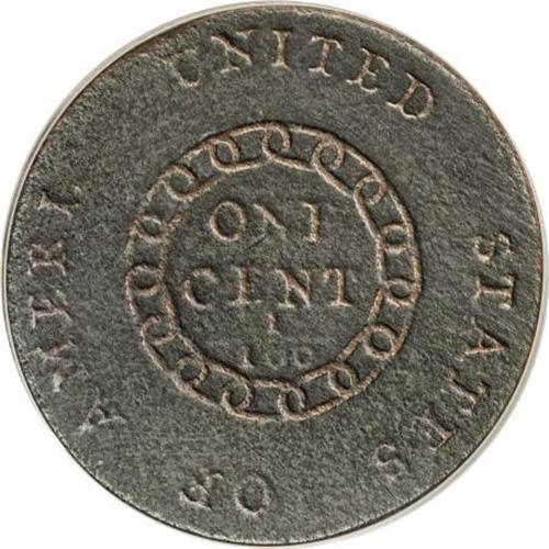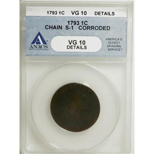 <B>1793 Chain 1C AMERI.--Corroded--ANACS. VG10 Details.</B></I> S-1, R.4. LIBERTY and all of the reverse design elements are strong, 1793 shows weakly, and the right half of Liberty's portrait is clear. Red-brown and sky-blue surfaces reveal micro-porosity. All of the design features are well centered on the planchet. EAC 4.<BR><BR><B>Coin Engraver:</B> Henry Voigt<BR><BR><b>Shipping:</b> Coins & Currency (<a target="_blank" href="http://www.heritageauctions.com/common/shipping.php">view shipping information</a>)