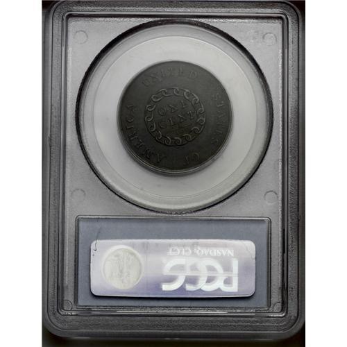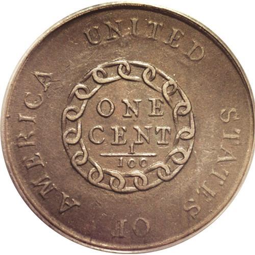 <B>1793 Chain<1C> AMERICA XF40 PCGS.</B></I> S-3, Low R.3. Close date with no periods on the obverse. Five die varieties were pressed into service during the production of 36,103 Chain cents in March 1793. The S-3 variety is easily the most plentiful today, and probably accounted for half of the original mintage, about 18,000 coins. The entire coinage utilized four obverse dies and two reverse dies. Attribution of these varieties is rather simple. Sheldon-1 has the abbreviated reverse with AMERI. instead of AMERICA. Sheldon-4 has periods following the date and LIBERTY. Sheldon-3 has a nearly straight bust line and the R of LIBERTY much larger than the adjacent E. RT of LIBERTY nearly touch on this variety. Sheldon-2 has a curved bust line, resembling a flattened S, and all the lettering is high above the head, closer to the border. Sheldon's NC-1 is the rarest of the Chain cent varieties with just two examples known. It also has a curved bust line with the letters in LIBERTY widely spaced and much closer to the top of Liberty's head. Of all varieties combined, approximately 1,000 Chain cents still exist, but most are in the lower circulated grades. Only about 50 to 75 examples survive in grades better than Very Fine.<BR> This is a splendid specimen. Although the design elements, especially on the obverse, are lightly obscured by wear, the surfaces are remarkable. Both sides have medium olive-brown color that is slightly lighter on the devices. A few faint scratches are evident on each side, but these are so old that they are entirely toned over and nearly impossible to see. EAC 25.