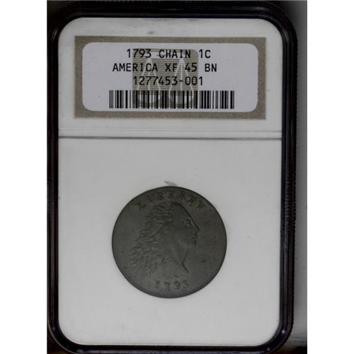 <B>1793 Chain<1C> AMERICA XF45 NGC.</B></I> S-3, Low R.3. The Chain AMERI was the first coin struck at the new Philadelphia Mint building, and these were followed by the Chain AMERICA cents, including the present example. All of the Chain cents were coined during the first two weeks of March, with eight deliveries dated from March 1 through March 12, 1793 totaling 36,103 coins. It has been suggested by some that the first Chain cents may have been struck on February 22, to celebrate Washington's birthday, although we are not aware of any documentary evidence to support such an occurrence. It is believed that the Sheldon-3 Chain cents represented about half of the mintage for the entire design, some 15,000 to 18,000 coins.<BR> The reverse design was meant to symbolize unity among the individual states of the young nation. Public opinion took a different view, suggesting that the chain was "a bad omen for Liberty." Mint Director David Rittenhouse soon ordered a change in the design, and the first Wreath cents were coined the following month.<BR> This is an exceptionally attractive representative of this ever-popular first-year cent. The hair detail on Liberty's portrait is uncommonly sharp, this despite a little light wear, and the reverse chain is crisp. All other features are bold, and the planchet is problem-free save for some light porosity. The only singularly mentionable blemishes are a planchet void (as struck) in the right obverse field and a not overly conspicuous spot in the reverse field below the E in UNITED. The otherwise medium brown toning yields to crimson colored accents in a few isolated areas. Worthy of a strong bid. EAC 20.<BR><I>From The Chief Paduke Collection.</B></I>