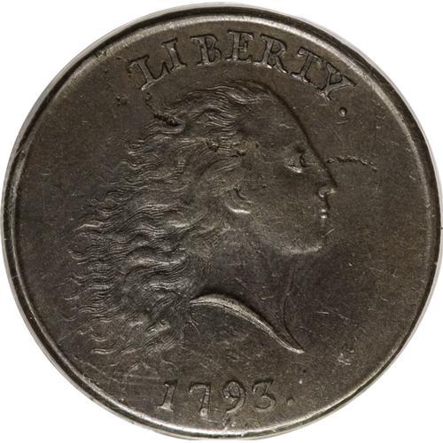 <B>1793 Chain 1C Periods AU55 PCGS.</B></I> S-4, B-5, High R.3. Die State II. Periods after LIBERTY and the date appear on this variety, and the reverse legend is completely spelled out as UNITED STATES OF AMERICA. The date and LIBERTY are each quite crowded. The L and B are too low, and the LI nearly touch. The R in LIBERTY was apparently corrected from a B--a condition that is quite clear on the present example, looking much like a B with an extra protrusion on the right side.<BR> The Breen large cent <I>Encyclopedia</B></I> makes an interesting observation regarding this variety. "On this obverse die, the hair is so differently treated from the rest as to suggest a different engraver. Perhaps this was a sample die by Joseph Wright leading to the engravership. Wright's 1792 pattern quarter obverse has a similarly soft treatment of the hair, and a period after LIBERTY. But if Wright did this, why is there no record of his part-time employment before appointment as engraver?"<BR> This coin shows that soft, feminine hair treatment to particularly good advantage, due to its near-Mint State grade. Those tresses show only a touch of highpoint rub. A large, irregular planchet flaw shows to the left of the L in LIBERTY, traveling downward onto the hair of Liberty. The small crack from the rim to the lower locks is plain and extends into the hair. Another crack points toward the date. Yet a third crack extends from RTY to the nearby period. A single mentionable abrasion is noted in the right obverse field before Liberty's eye, while the reverse is choice, bold, and distraction-free. Perusal with a loupe otherwise reveals only light evidence of contact. The surfaces are medium olive-brown, and there are no unsightly rim bumps or bruises. PCGS has graded three examples of the 1793 Chain Periods cents in AU55, exceeded only by a single MS65 specimen. EAC 35.<BR><BR><b>Shipping:</b> Coin/Currency (<a target="_blank" href="http://www.heritageauctions.com/common/shipping.php">view shipping information</a>)