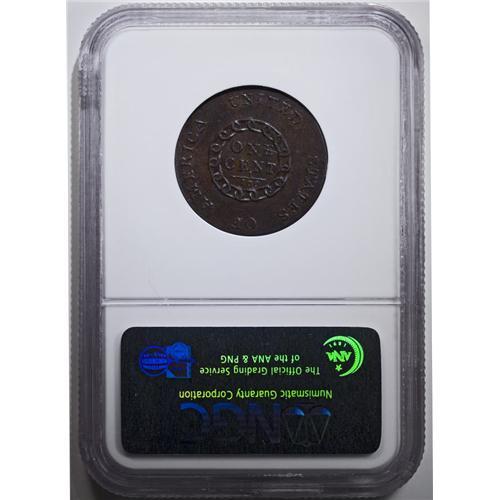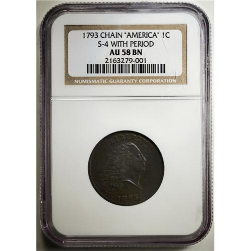 <B>1793 Chain<1C> Periods AU58 NGC.</B></I> S-4, R.3. Although generally considered a single design, there are actually three different types of the Chain cent, and each is an important entry in the history of early American coinage. These three types are the Chain, AMERI; the Chain, AMERICA; and the Chain, Periods. The Periods variety was the last of the Chain cents to be coined. Several stylistic differences are noted on this final die variety of the Chain cent sequence, suggesting that these pieces may have been produced by a different engraver than the previous varieties. Walter Breen speculated that the obverse die may have been produced by Joseph Wright, on the strength of the periods after the date and LIBERTY. The 1792 pattern quarter dollars, known to be a product of Wright's hand, also have a period after the word LIBERTY. Alternatively, Harry Salyards (editor of <I>Penny-Wise</B></I>) once suggested that this obverse may have been from the same person who engraved the Wreath cents, on the basis that the treatment of hair at Liberty's brow and temple are more like the Wreath cents than either the earlier Chain cents or the Liberty Cap coins.<BR> The example that is now offered is a splendid specimen. Both sides have smooth dark chocolate surfaces, with some lighter tan color on the reverse. It is sharply struck with strong design details and only slight wear on the high points. Both sides have light abrasions but few other defects of note. The obverse has a line of planchet lamination from the L, across Liberty's head, and through the eye before continuing into the right obverse field. This is a late die state example, although not the terminal die state. Two obverse die cracks from the border at 7 o'clock form a V, one extending into the lower hair strands, the other following the border toward the date. Another die crack joins the base of RTY and the period. EAC 35.