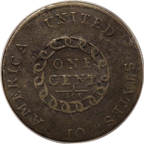 <B>1793 Chain 1C Periods Fine 12 PCGS.</B></I> S-4, B-5, R.3. An impressively detailed example with full, bold legends, including the small periods after the date and LIBERTY. Sheldon-4 is the only Chain cent variety with these two periods, and is considered scarcer than Sheldon-3. The medium brown surfaces are generally mildly granular, aside from an area of moderate pitting near the profile. A couple of slender horizontal marks reach Liberty's neck, but are of little consequence. Given the low quality of most surviving Chain cents, often encountered with illegible dates, rim damage, and/or heavy corrosion, the present piece will be eagerly accepted by the experienced early type set collector. Encapsulated in a green label holder. EAC 4.<BR><BR><b>Shipping:</b> Coins & Currency (<a target="_blank" href="http://www.heritageauctions.com/common/shipping.php">view shipping information</a>)