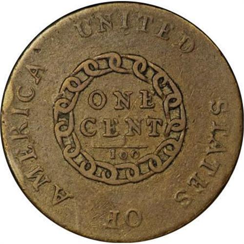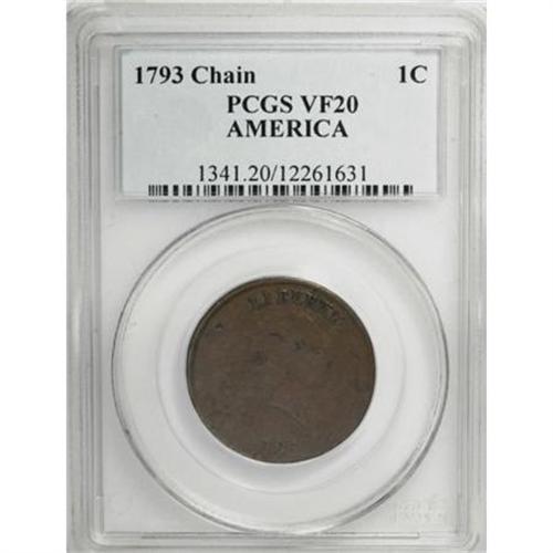 <B>1793 Chain 1C Periods VF20 PCGS.</B></I> S-4, B-5, High R.3. Breen Die State III. For certain early copper issues, especially Chain cents, the grading services tend to forgive surface problems such as corrosion, planchet flaws and porosity. This is understandable considering that most of these early coppers were struck on already-doomed planchets or succumbed to the elements over the years. As a result, one certified VF20 could have far superior surface quality and subsequent eye appeal than the next VF20. In this regard, the example offered here is far above average. The planchet is amazingly smooth for the issue and the surface coloration is a consistent, light milk-chocolate throughout. Three small obverse ticks, although not distracting, are identified here for the sake of full disclosure.<BR> This is S-4, also known as the With Periods variety, due to the presence of a period after LIBERTY and also the date. In the case of this coin, only the period after the legend is obvious. The localized weakness in the area to the right of the date is observed on many S-4 Chain cents and is the direct result of a slight die misalignment; the obverse rim is usually bold from 7 o'clock to 2 o'clock, yet comparatively weak in the lower right quadrant. The reverse legend is complete, with the central detail being bold as usual. Although not the scarcest of the four collectible 1793 Chain cent varieties, S-4 is seen about half as often as its S-3 counterpart. A pleasing, mid-grade piece that would be a welcomed addition to any collection. Population: 18 in 20, 92 finer (12/07). EAC 10.<BR><BR><B>Coin Engraver:</B> Henry Voigt<BR><BR><b>Shipping:</b> Coins & Currency (<a target="_blank" href="http://www.heritageauctions.com/common/shipping.php">view shipping information</a>)