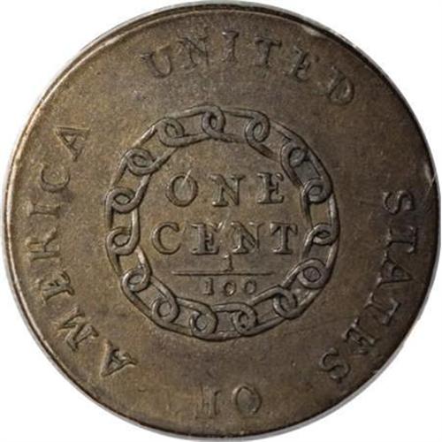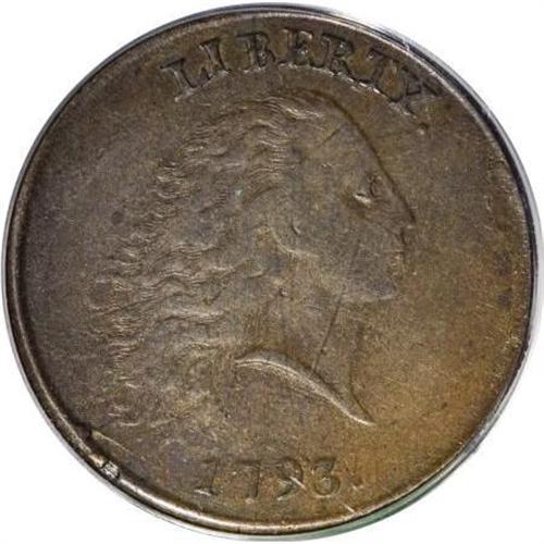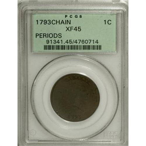 <B>1793 Chain 1C Periods XF45 PCGS.</B></I> S-4, B-5, R.3. Die State III. This memorable example of the Chain, Periods Sheldon-3 variety ranks among the top dozen pieces known for the variety, with overall good appeal and pleasing planchet surface quality. The variety is easily distinguished by the periods that appear after both the date and LIBERTY. The date and LIBERTY are also closer on this variety than any other of the Chain variants. The L and B are low and nearly touching. Walter Breen's <I>Encyclopedia of United States Large Cents </B></I>notes that "on the obverse die, the hair is so differently treated from the rest as to suggest a different engraver. Perhaps this was a sample die by Joseph Wright leading to the engravership. Wright's 1792 pattern quarter obverse has a similarly soft treatment of the hair, and a period after LIBERTY. But if Wright did this, why is there no record of his part-time employment before appointment as engraver?"<BR> <I> </B></I>This coin is in an extremely late die state for the variety. The rim break where the first two die cracks that Breen delineates come together is noticeably heavy. There is another crack visible all the way from RTY through BER and I to the rim (this last "faintly," as Breen says). The wavy raised lines before the mouth, chin, and neck, apparent die clashes from the chain, are bold. Although the beautiful surfaces are a pleasing medium-brown, there is a small retained planchet lamination from 2:30 to 3 o'clock, near the rim and just before Liberty's nose. Sufficient hair detail remains on the obverse that one can truly appreciate the designer's fine touch in Liberty's hair, which appears as individual strands that resolve into thick tresses.<BR> The reverse, stronger as always, shows hints of muted mint red near the borders, and only a single tiny tick on the rim, above CA, requires singular mention. <BR> This piece, certified in a green-label holder, ranks among the top dozen or so pieces known for the variety. EAC 35.<BR><BR><B>Coin Engraver:</B> Henry Voigt<BR><BR><b>Shipping:</b> Coins & Currency (<a target="_blank" href="http://www.heritageauctions.com/common/shipping.php">view shipping information</a>)